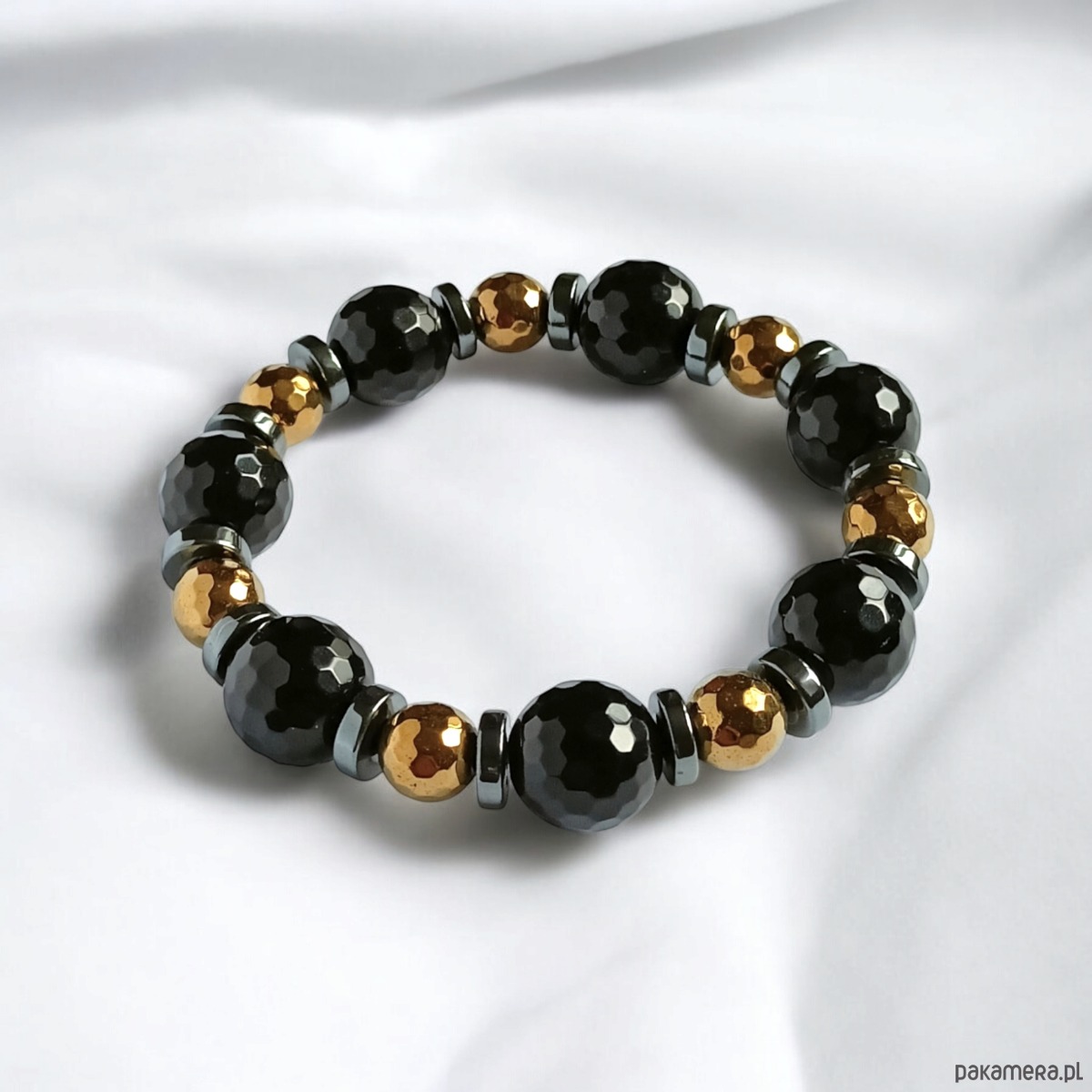 tutaj: zjawiskowa bransoletka na solidnej lince elastycznej, wykonana z fasetowanego onyksu (duże kule 12,5mm) oraz grafitowego i złotego hematytu.