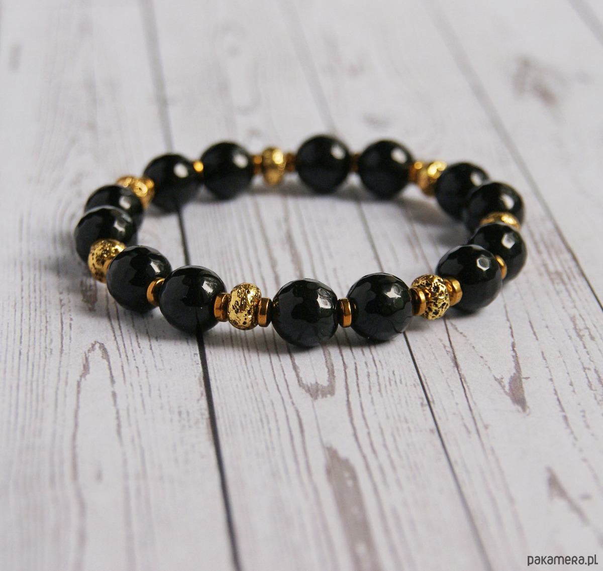 tutaj: zjawiskowa bransoletka na solidnej lince elastycznej, wykonana z fasetowanego onyksu (kule 10mm) oraz złotej lawy i złotego hematytu.