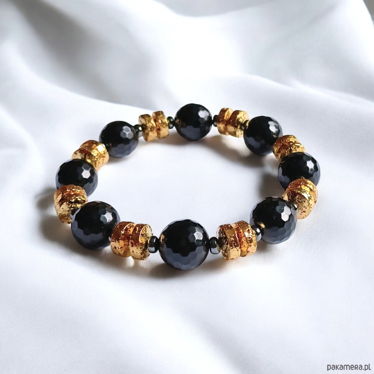 tutaj: zjawiskowa bransoletka na solidnej lince elastycznej, wykonana z fasetowanego onyksu (duże kule 12,5mm) oraz galwanizowanej złotej lawy i grafitowego hematytu.