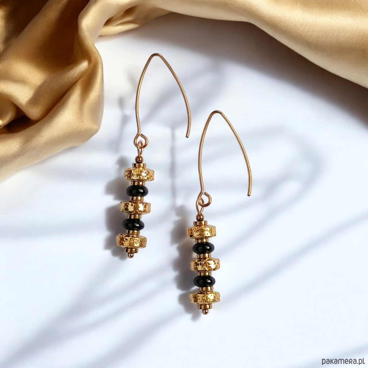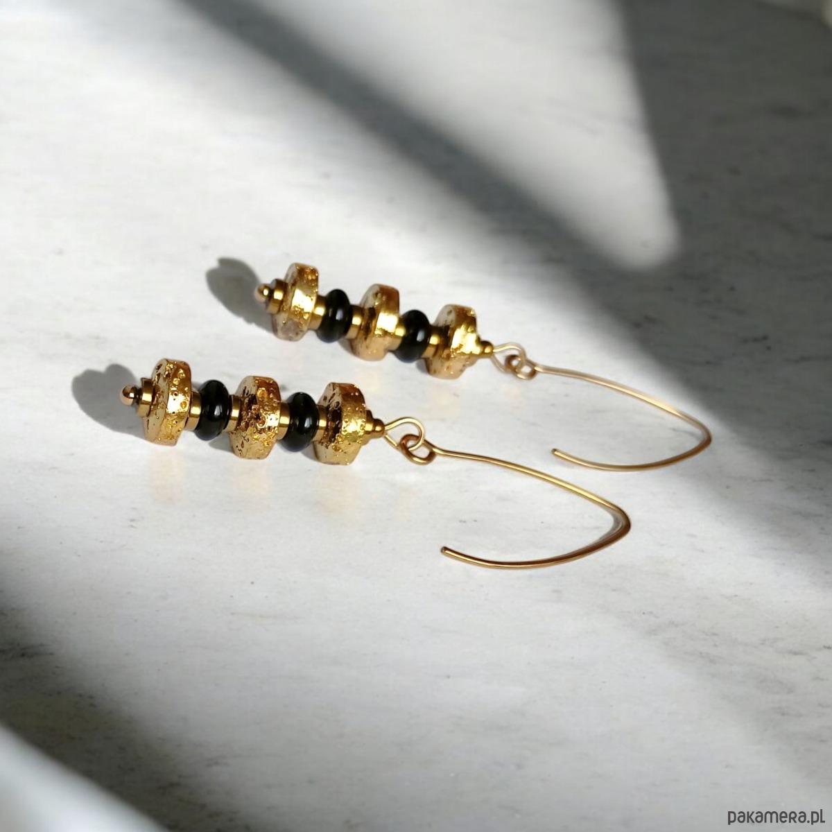 Wykonane z galwanizowanej złotej lawy wulkanicznej (9mm) oraz plasterków czarnego onyksu i przekładek ze złotego hematytu.