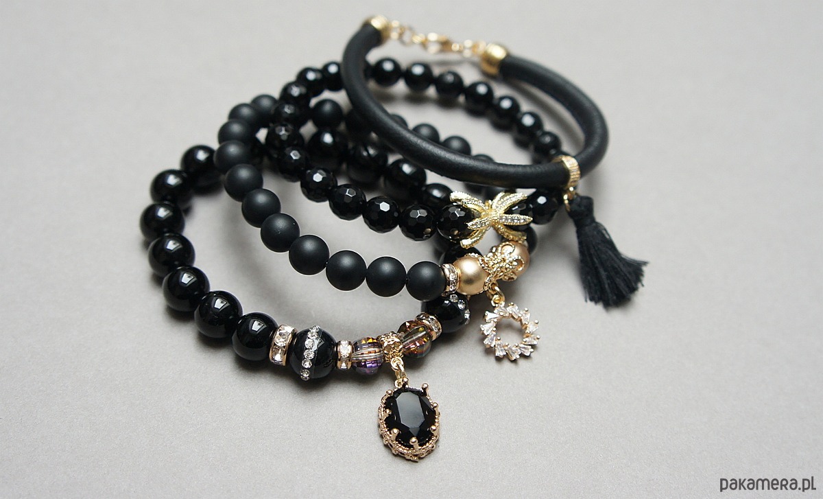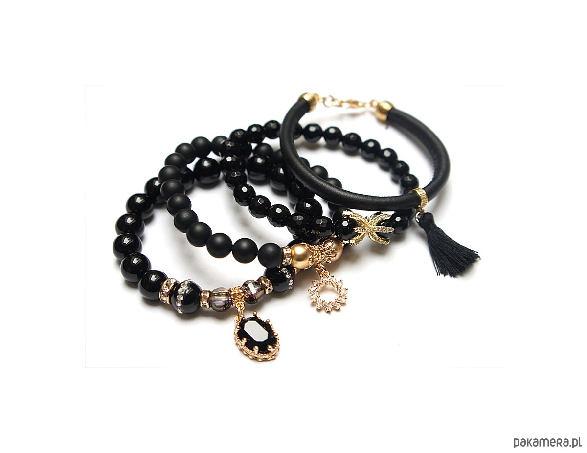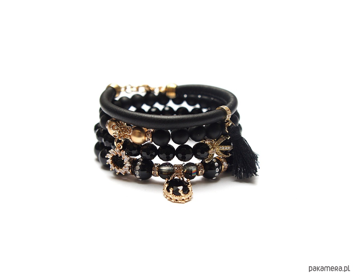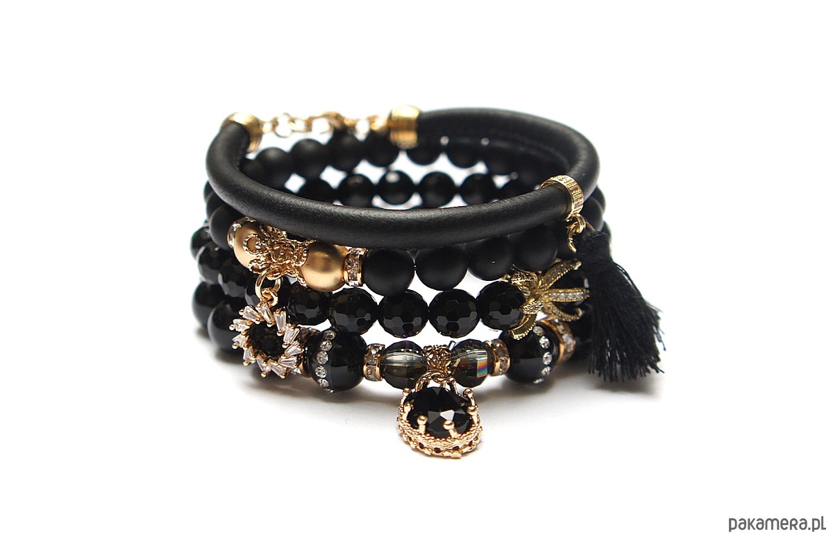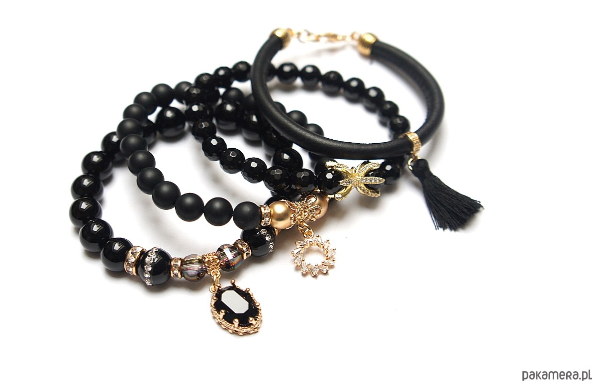 Komplet czterech bransoletek wykonanych z naturalnych kamieni - onyks [8 i 10mm], onyks wysadzany cyrkoniami [10mm], blackstone matowy [8mm], hematyt platerowany [8mm], kryształków fasetowanych [8mm], rzemienia z naturalnej skóry [śr. 5mm], chwostu, zawieszki wysadzanej cyrkoniami, zawieszki ze szkła w okuciu oraz elementów metalowych w kolorze złotym. Bransoletki pasują na nadgarstek 16 - 17cm. Biżuteria ozdobnie zapakowana