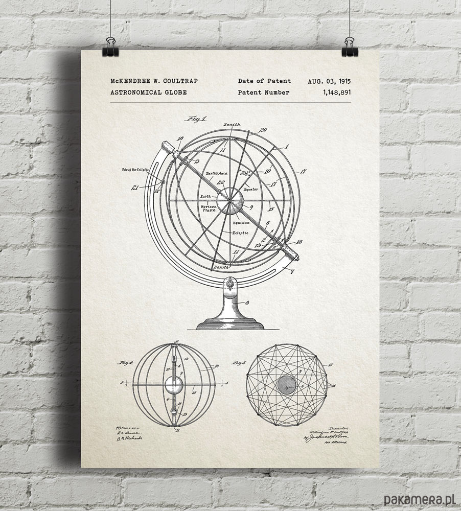 Plakat z reprodukcją patentu na globus astronomiczny, zaprojektowany przez McKendree W. Coultrap'a. Patent o numerze 1,148,891 został udzielony w 1915 roku przez Urząd Patentów i Znaków Towarowych Stanów Zjednoczonych.