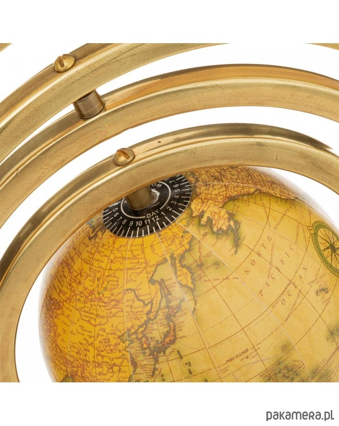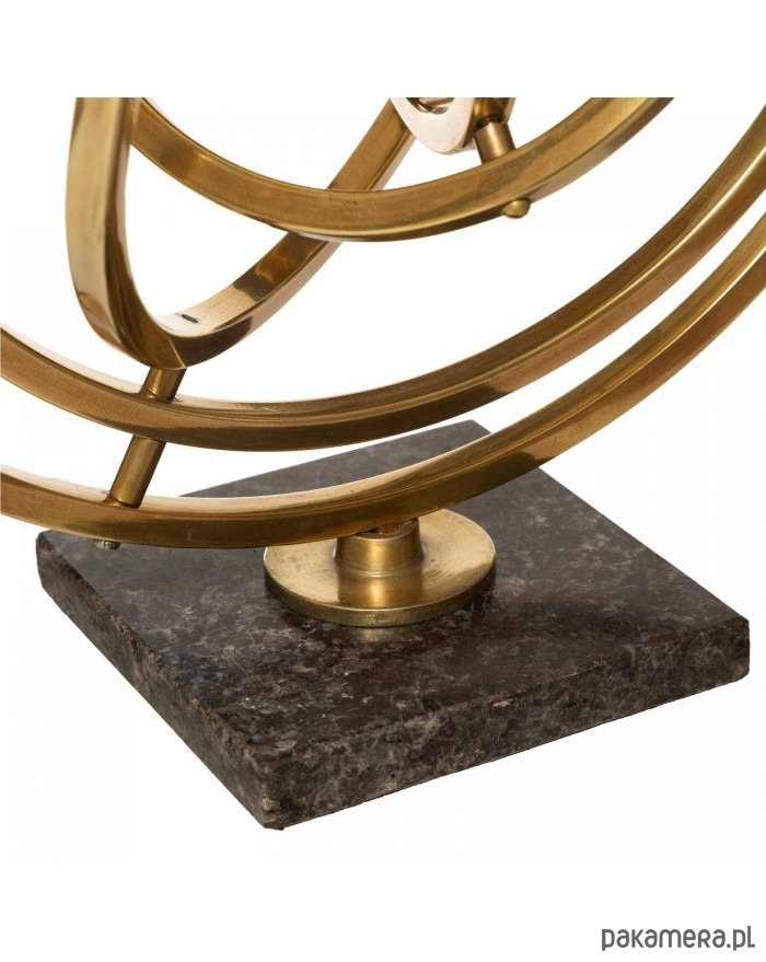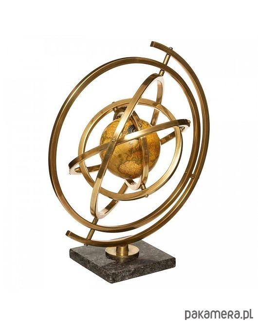 Efektowny globus wykonany z metalu o złotym kolorze. Posadowiony na marmurowej płytce. Dokoła kuli ziemskiej koliste obręcze sugerują orbity. Piękna dekoracja.