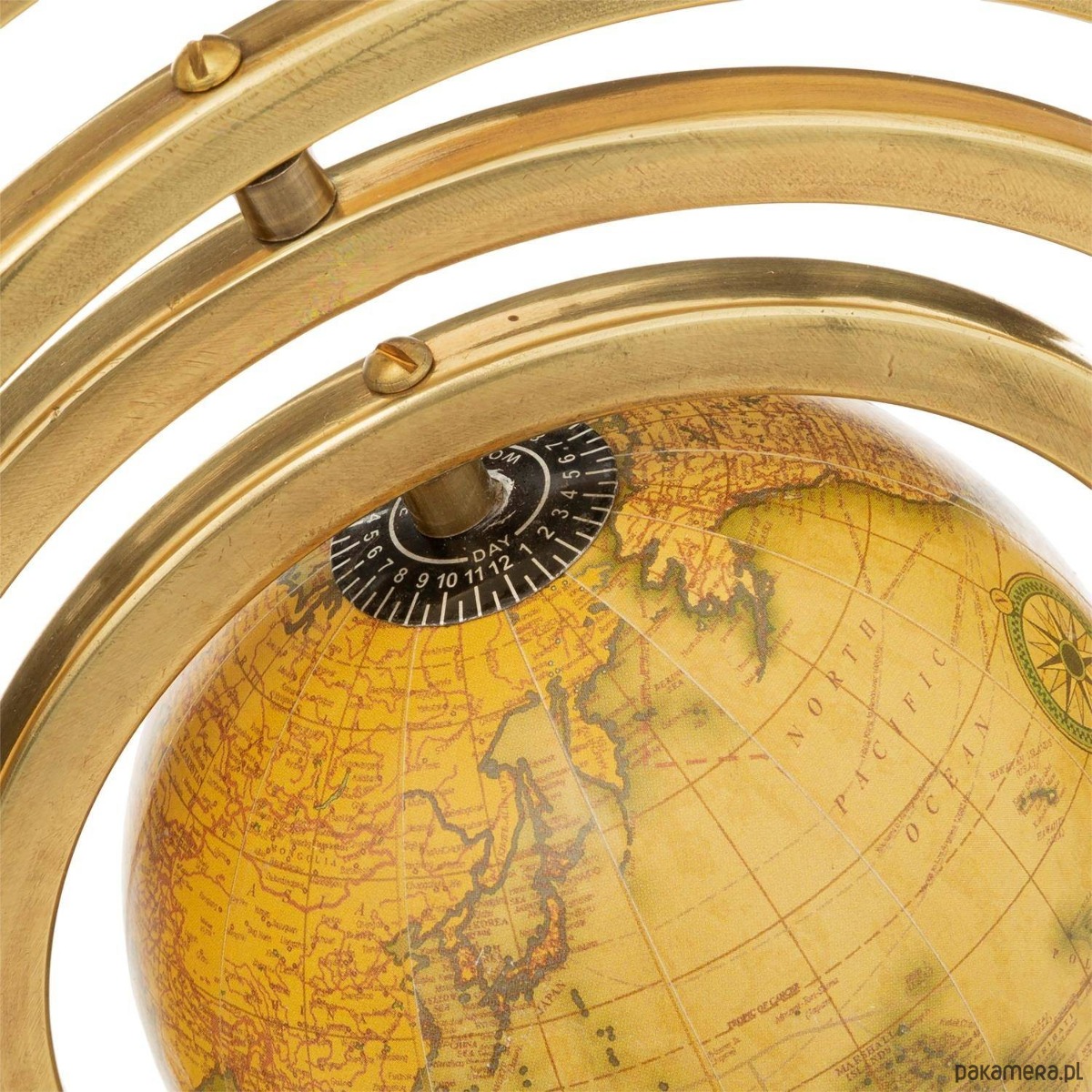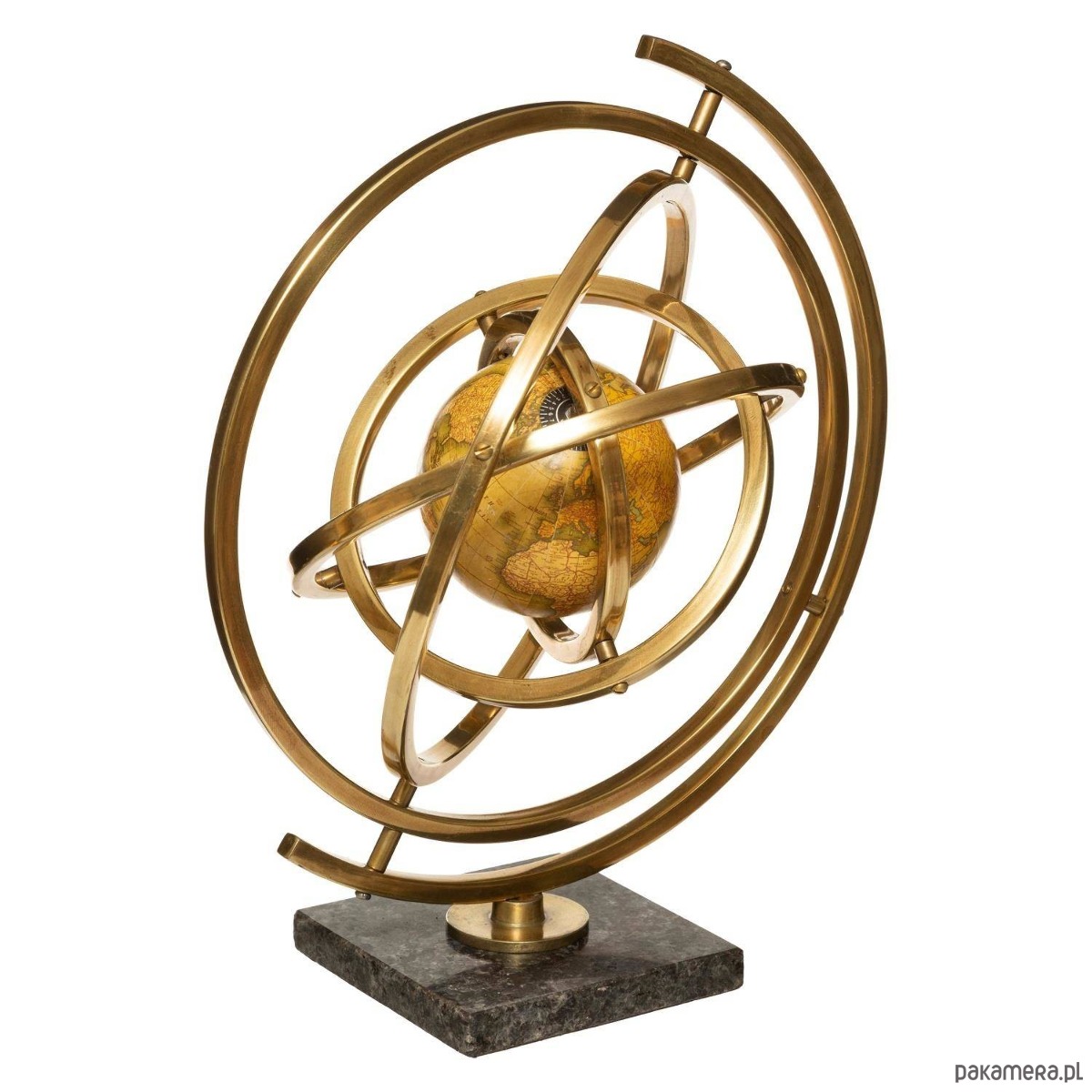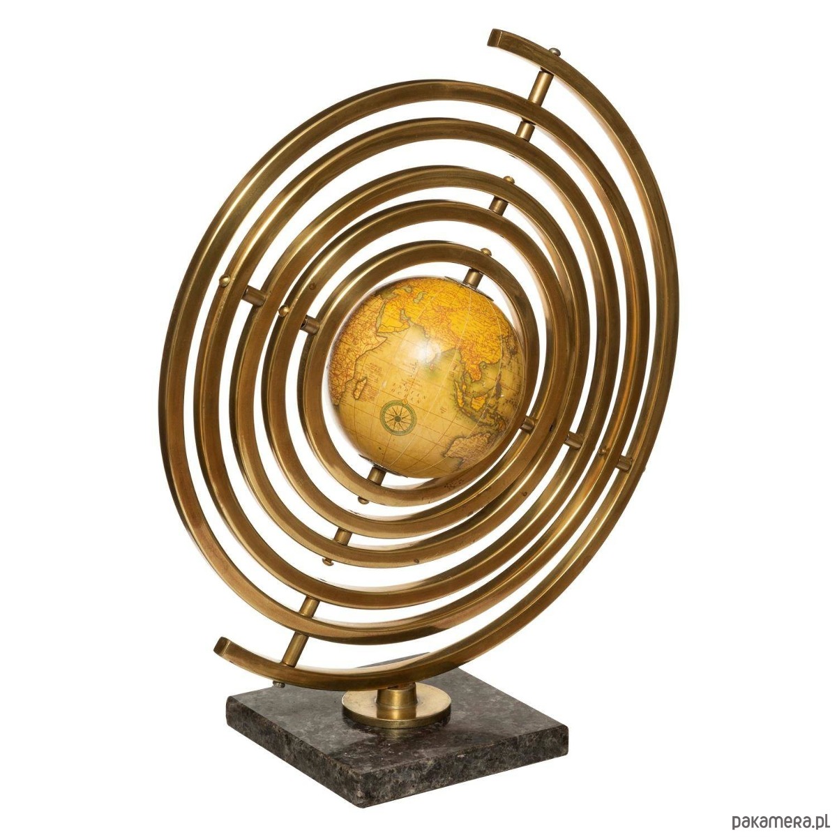 Efektowny globus wykonany z metalu o złotym kolorze. Posadowiony na marmurowej płytce. Dokoła kuli ziemskiej koliste obręcze sugerują orbity. Piękna dekoracja.Wymiary: wysokość 37 cm; głębokość 30 cm; szerokość 30 cm.