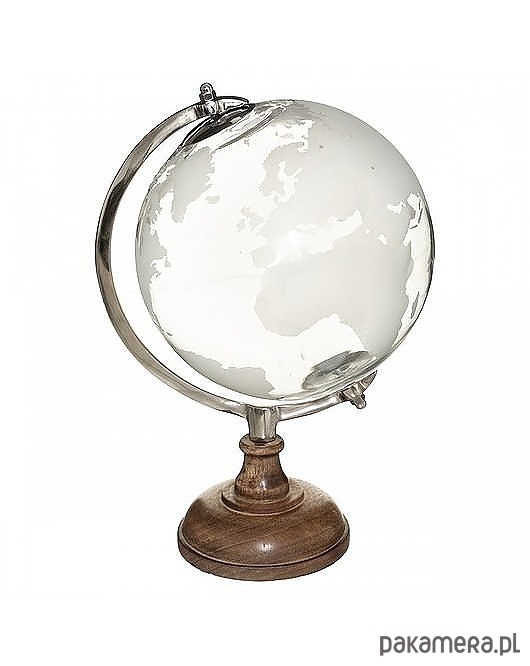 Piękna dekoracja pokoju - globus na podstawie drewnianej. Kula ziemska wykonana została ze szkła i osadzona jest na podpórce z metalu w kolorze srebrnym.