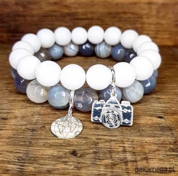 Czaki Bransoletki to modna, ręcznie wykonana bransoletka z naturalnych kamieni agatu szarego 10mm /każdy kamień jest inny i może lekko różnić się od zdjęcia/ lub białego 10mm. Zawieszki globus i aparat fotograficzny wykonane ze srebra 925.