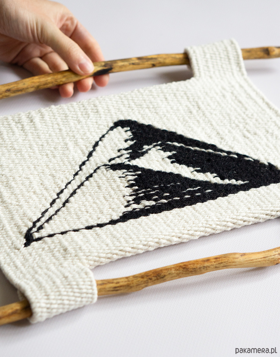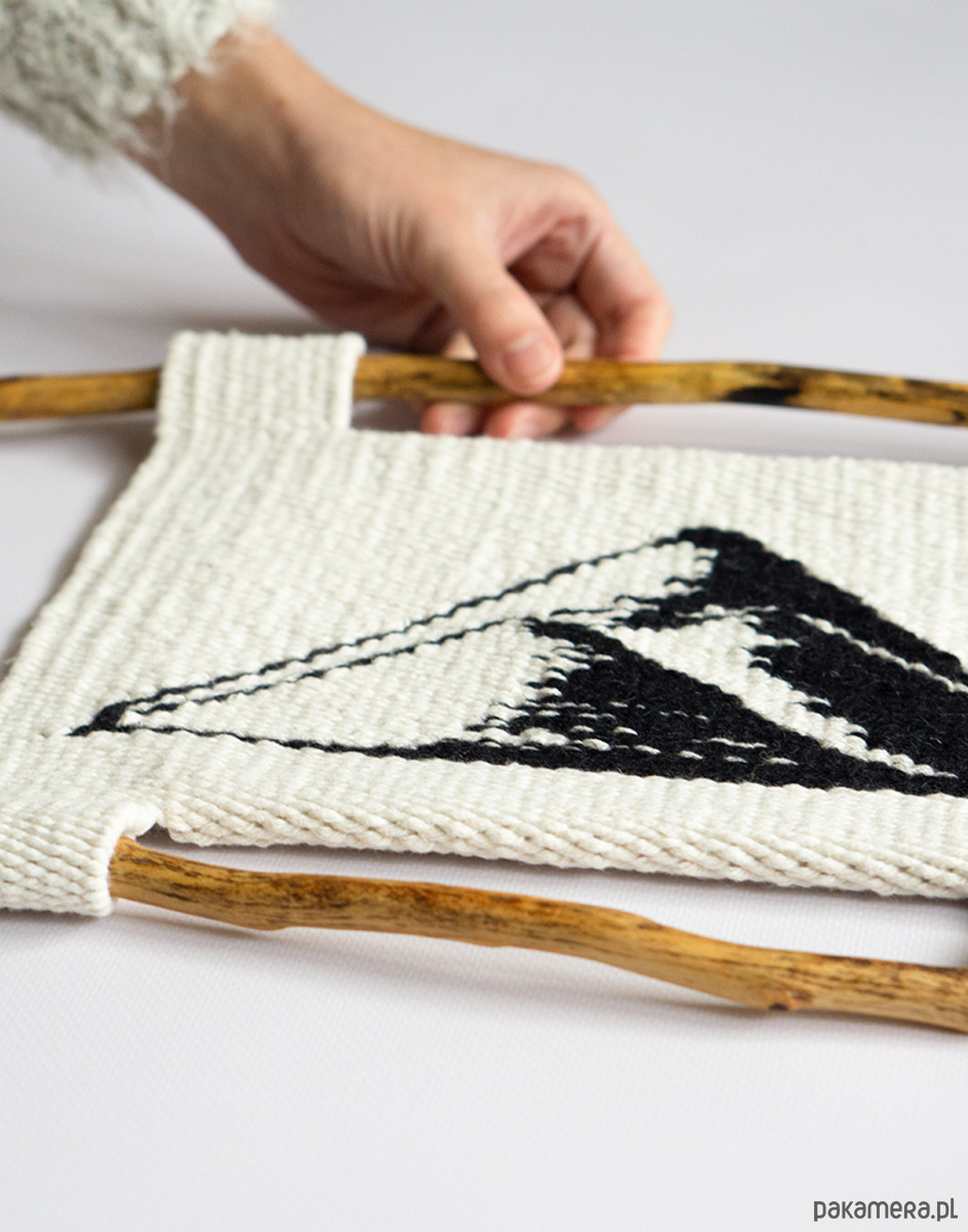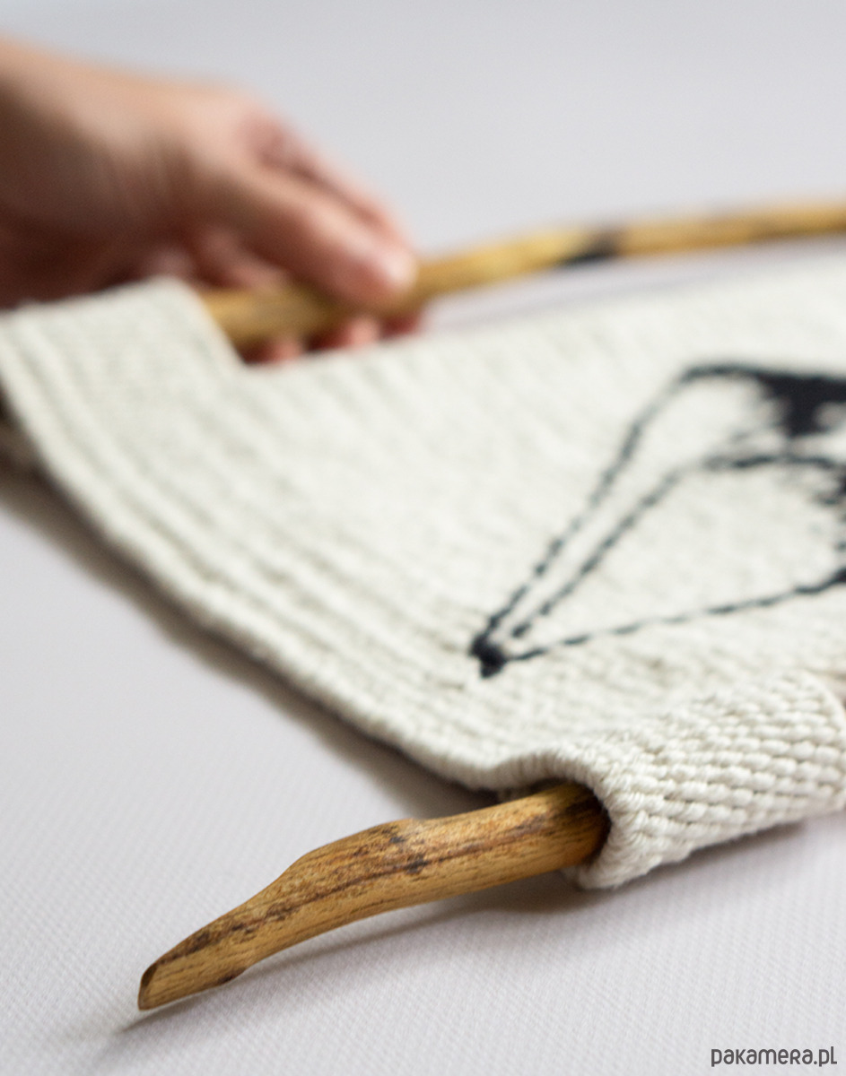 Do gobelinu dołączone są dwa drewniane patyczki, które pełnią funkcję naturalnego, ekologicznego zawieszenia. Patyczki zostały znalezione w lesie dlatego mają nieregularne kształty, naturalne krzywizny i sęki, co podkreśla wyjątkowy, organiczny charakter tkaniny. W razie potrzeby można je łatwo wyjąć.