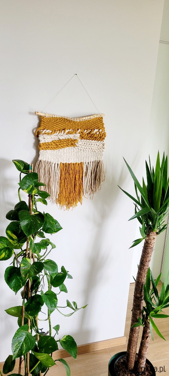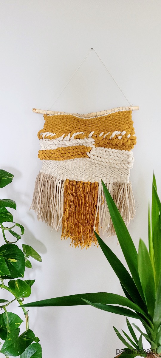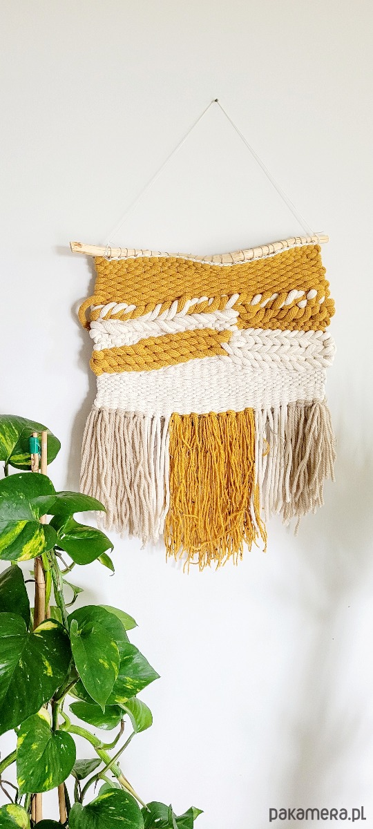 Ciepła paleta barw – od bieli po głęboki miodowy żółty – przywodzi na myśl pierwsze promienie słońca i letnie pola zboża. Mięsiste sploty i kontrastowe faktury nadają tej dekoracji głębię i wyrazistość, zachowując jednocześnie naturalną, lekką formę.