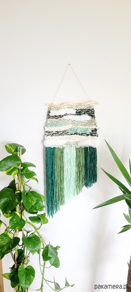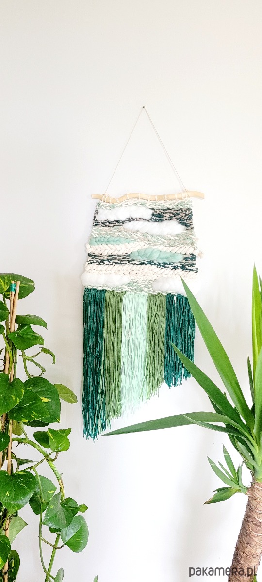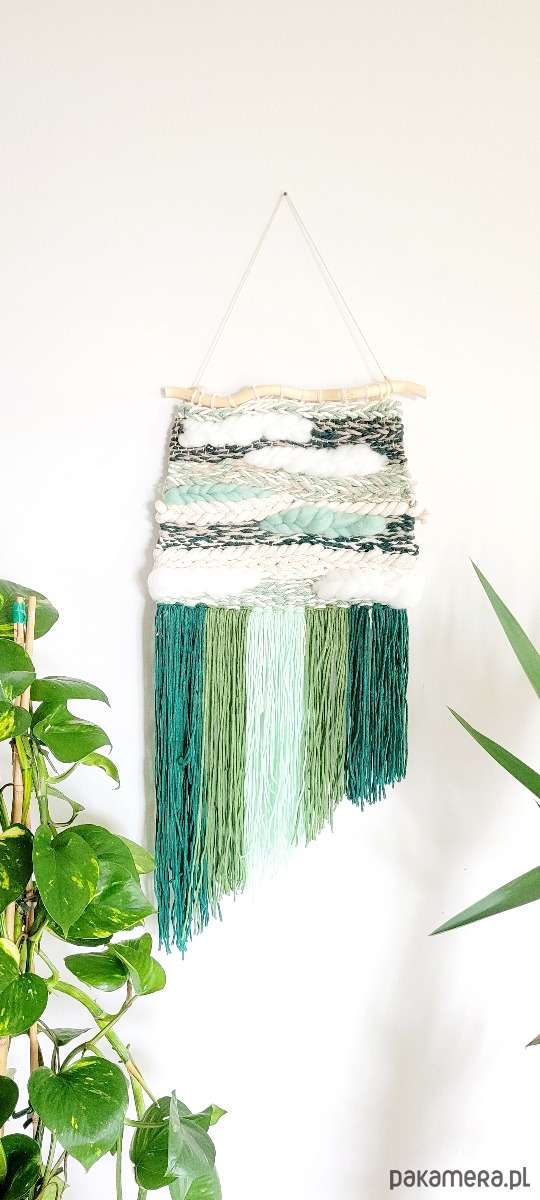 Ręcznie tkany gobelin w odcieniach bieli, mięty i głębokiej zieleni. Inspirowany naturą - stworzy harmonijną przestrzeń w salonie, sypialni lub biurze.