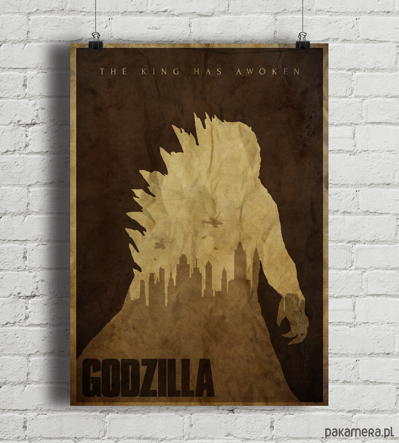 Plakat z autorską grafiką inspirowaną filmem "Godzilla", reż. Gareth James Edwards.