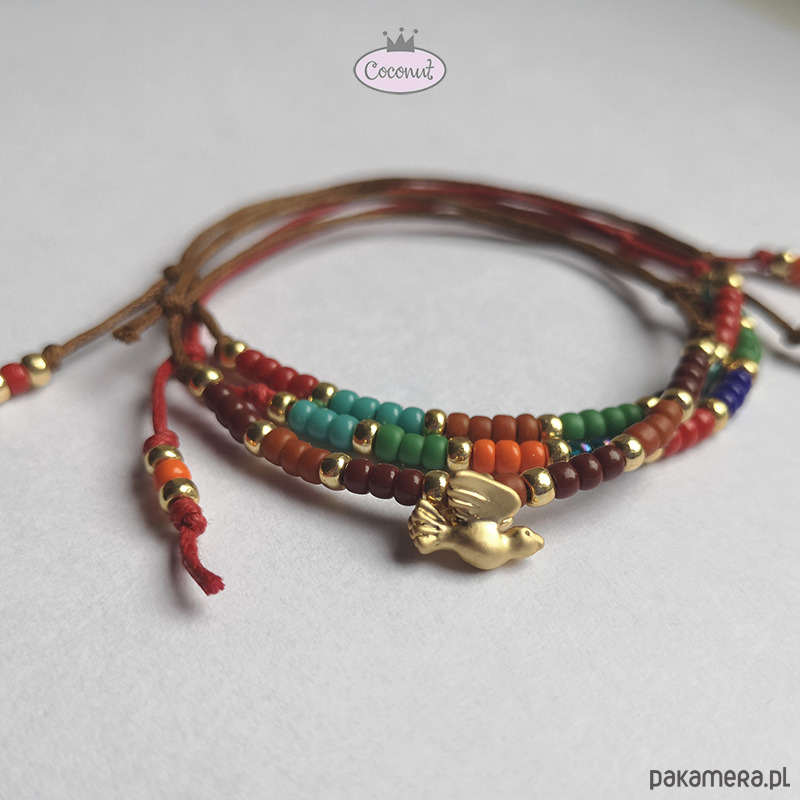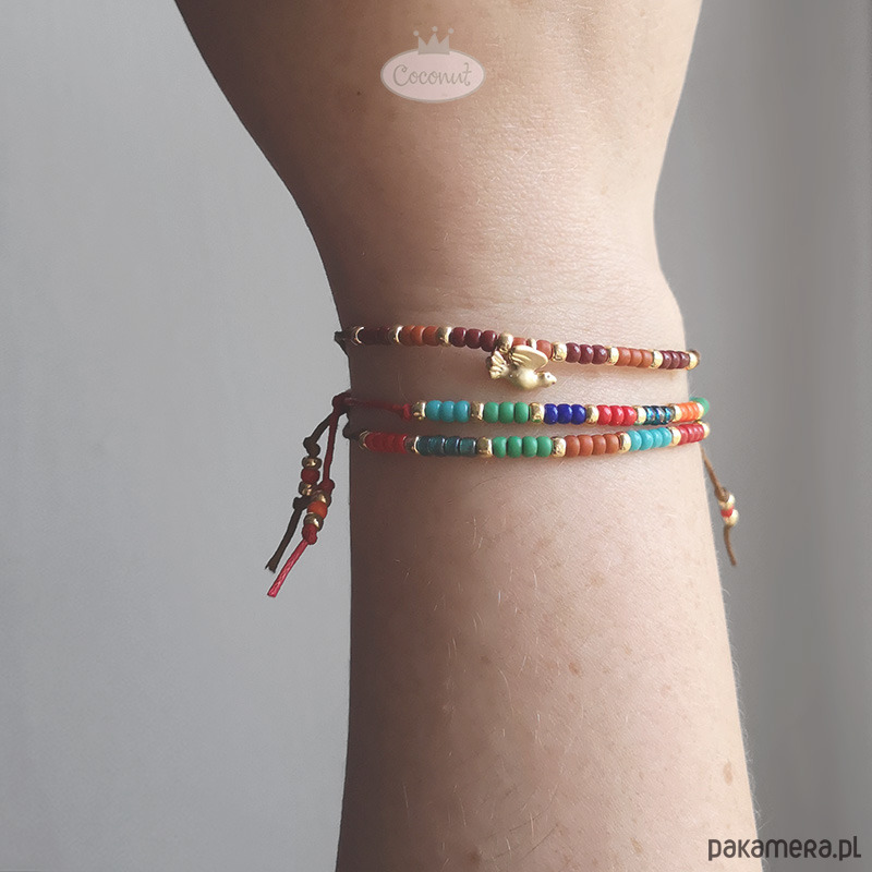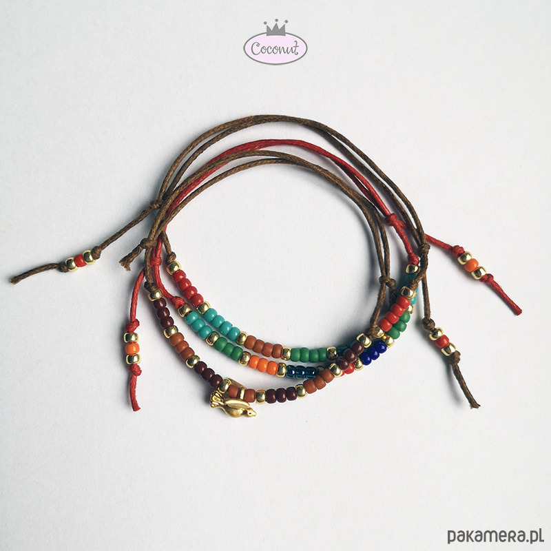 Trzy kolorowe bransoletki na bawełnianym sznurku,