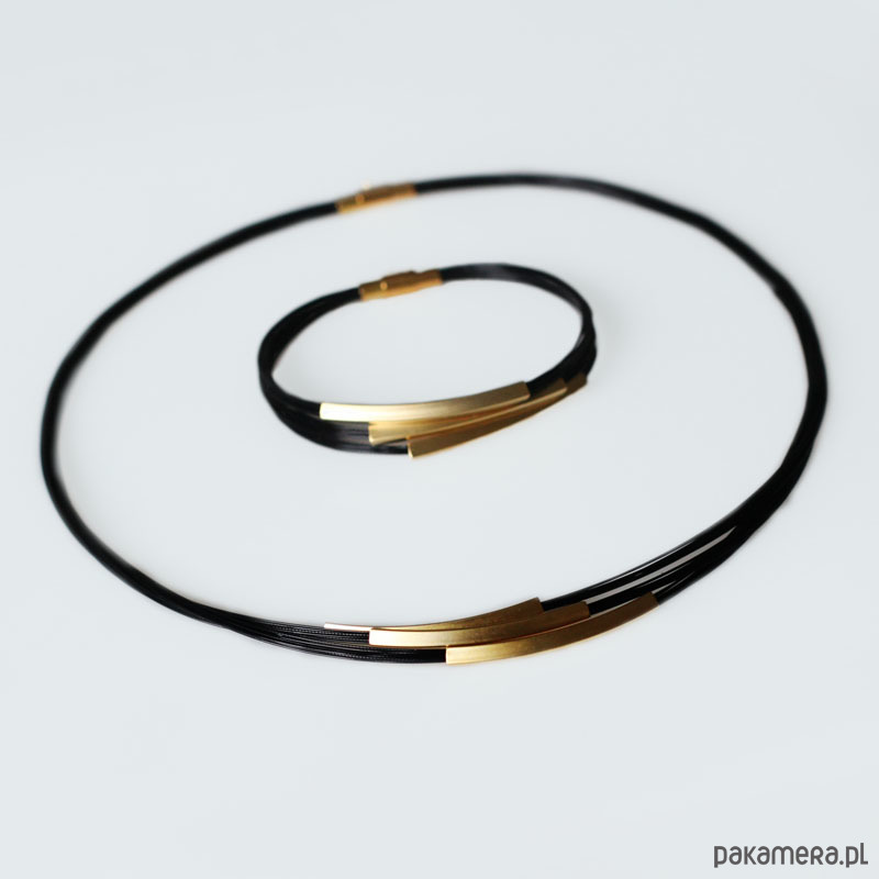 Materiał: sztabki z mosiądzu platerowanego złotem, stalowa linka jubilerska powlekana.