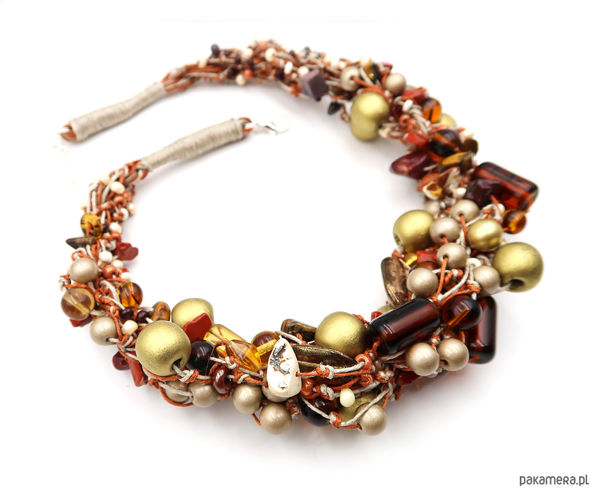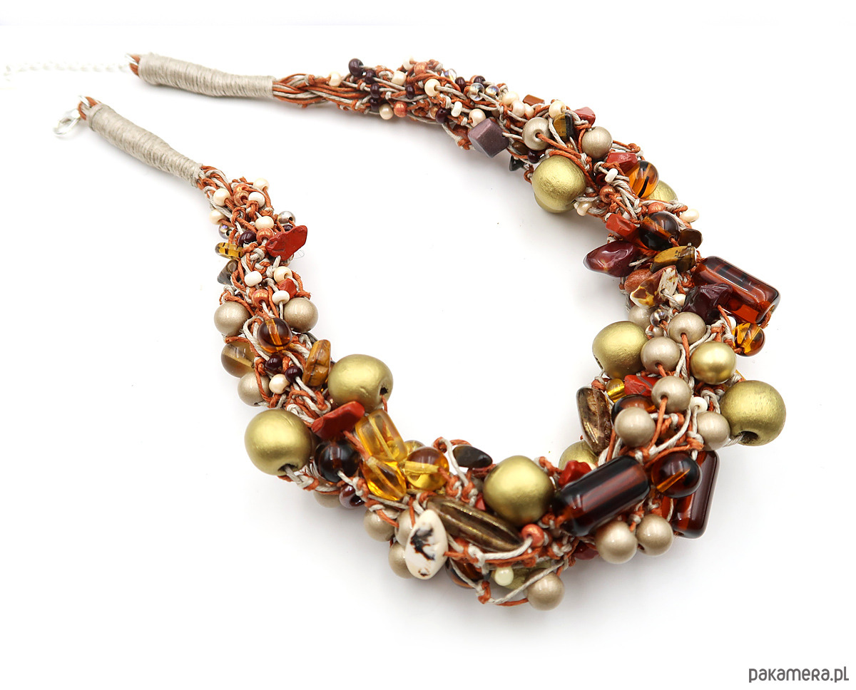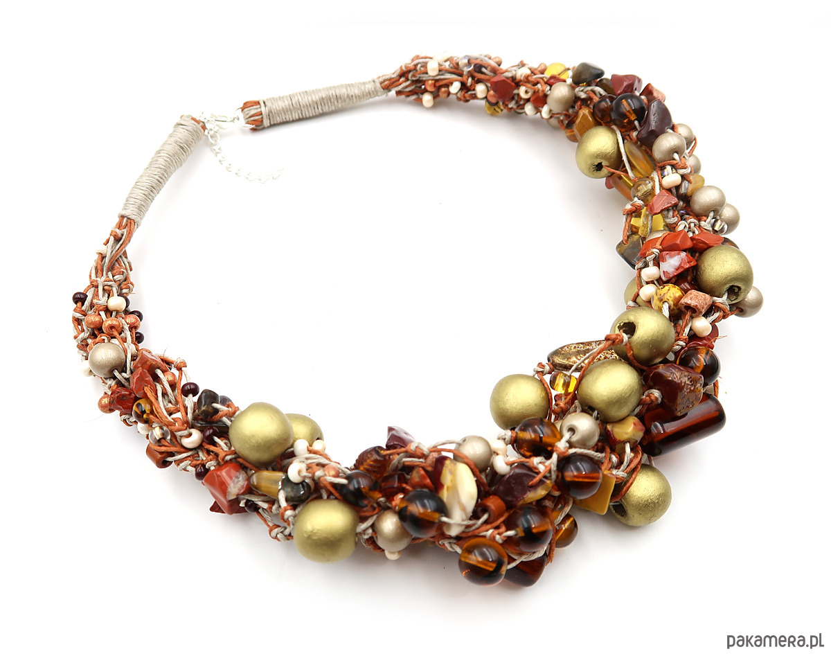Bogata, ręcznie wykonana kolia stworzona na bazie naturalnej przędzy lnianej. Nasycona odcieniami ciepłych czekoladowych brązów i beżu, z subtelnymi akcentami złota. Kompozycja splata w sobie różnorodne faktury i materiały: szklane korale, drewniane elementy, jaspisy, masę perłową oraz charakterystyczne szkło czeskiej marki Jablonex.
