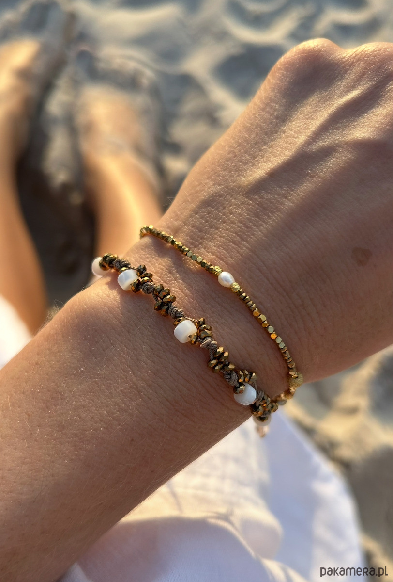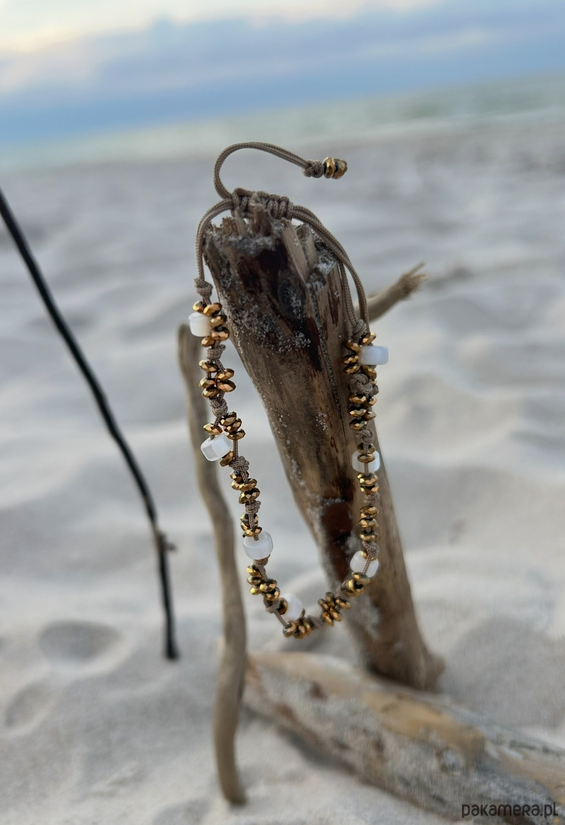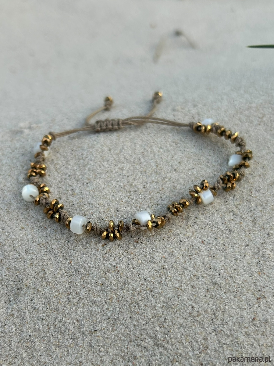 Bransoletka ze złotych hematytów, na beżowym sznureczku. Pleciona.