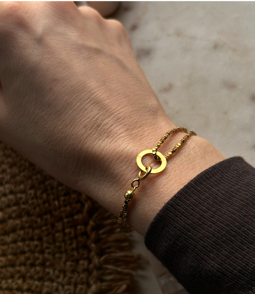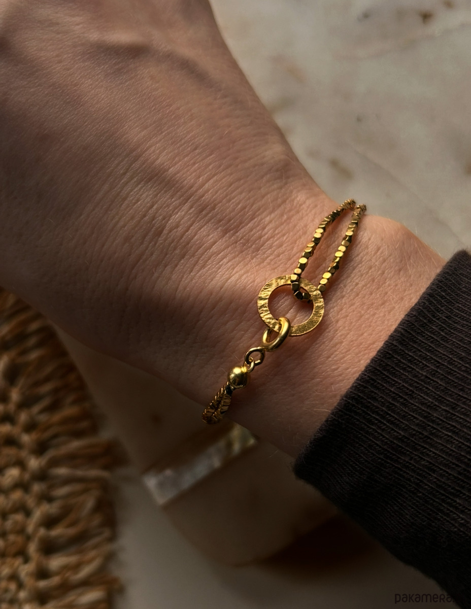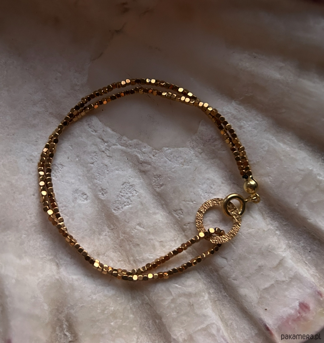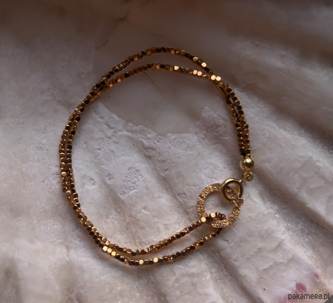 Bransoletka ze złotych hematytów. Kamienie wielkości 1 mm, w kształcie drobniutkich kosteczek.
