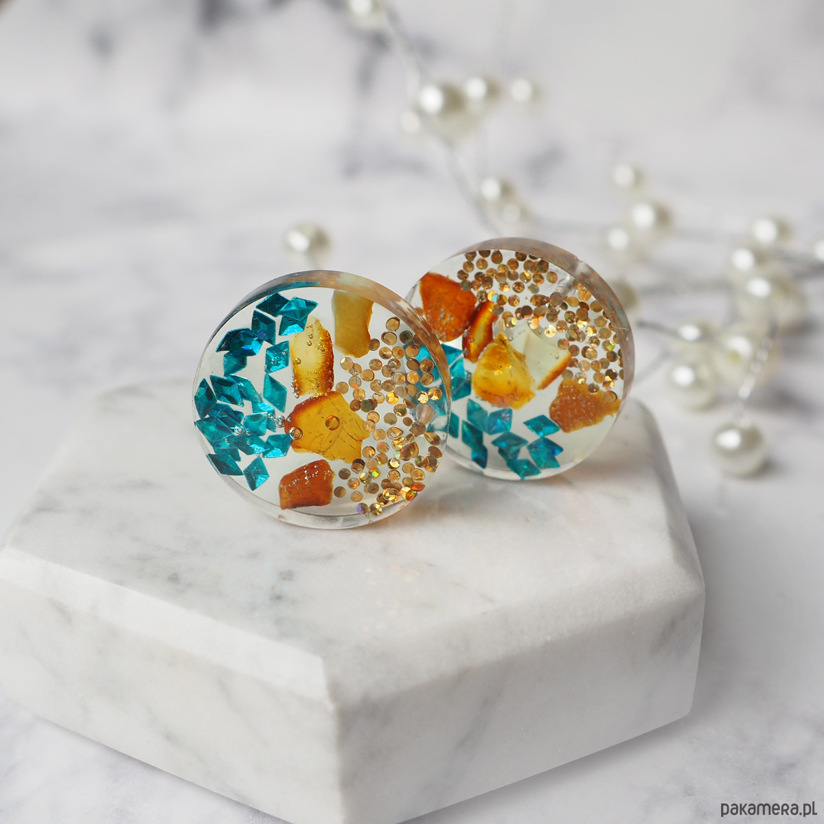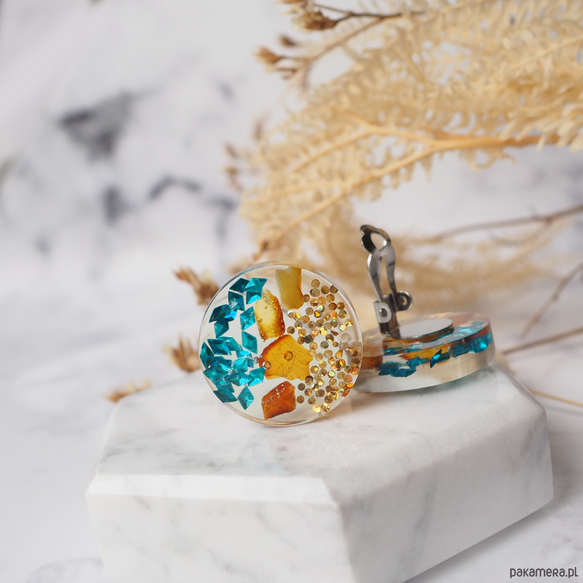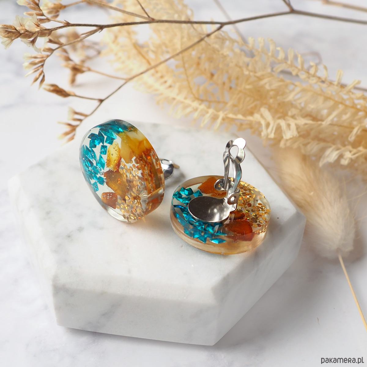 GOLDEN COAST , klipsy z żywicy i bursztynu