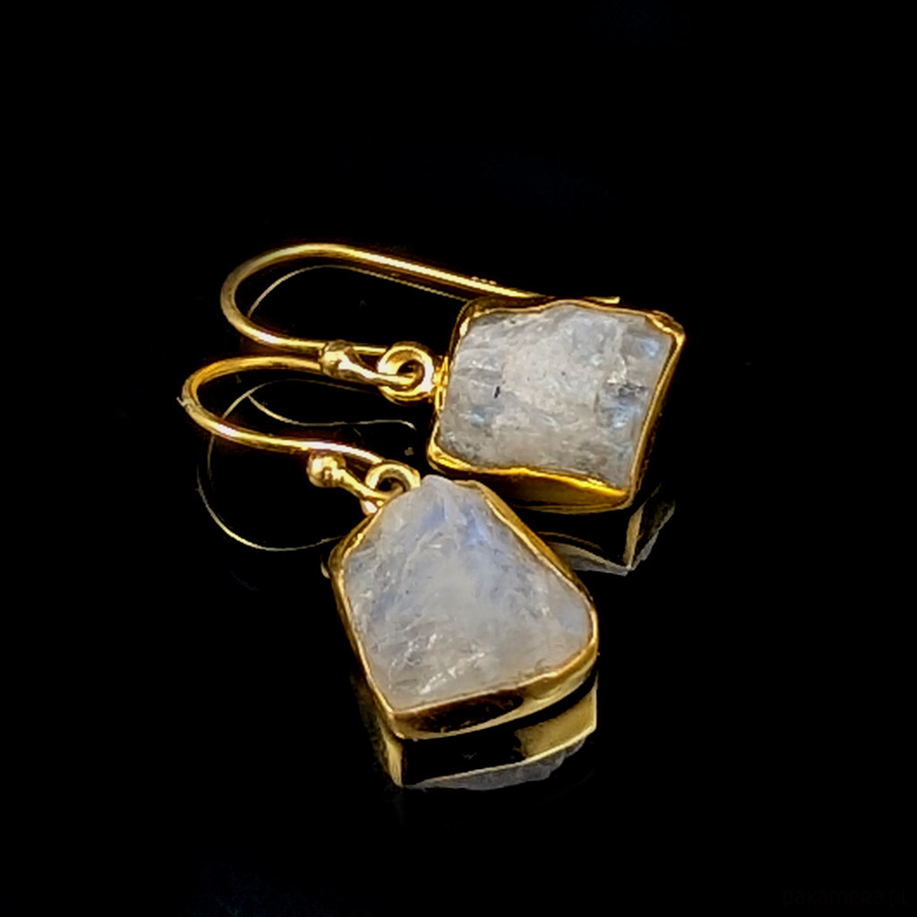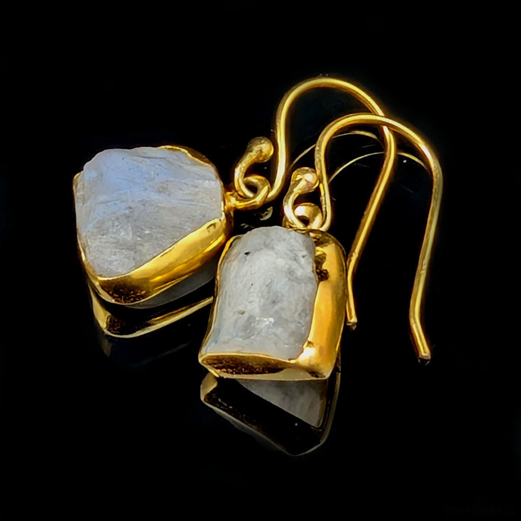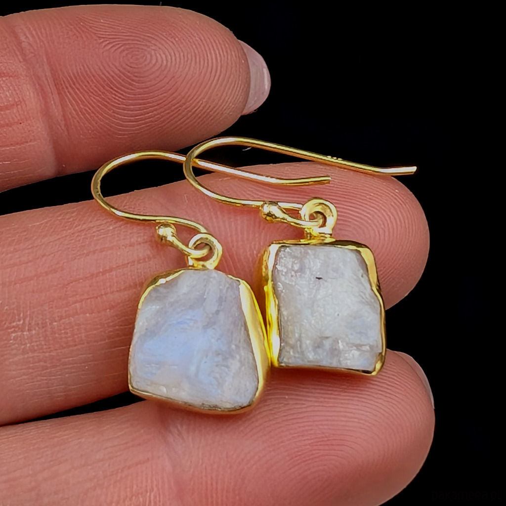 Kolczyki wykonane z pozłacanego srebra próby 925 oraz pieknych, surowych kamieni księżycowych. Wymiary całej oprawy 11 x 10 mm, długość z biglami 27 mm. Waga jednego kolczyka 1,8 grama. Złoconie wykonane jest delikatnie, z czasem może się ścierać. Wykonane przez dostawcę kamieni. Kolczyki zostaną wysłane w ozdobnym pudełeczko