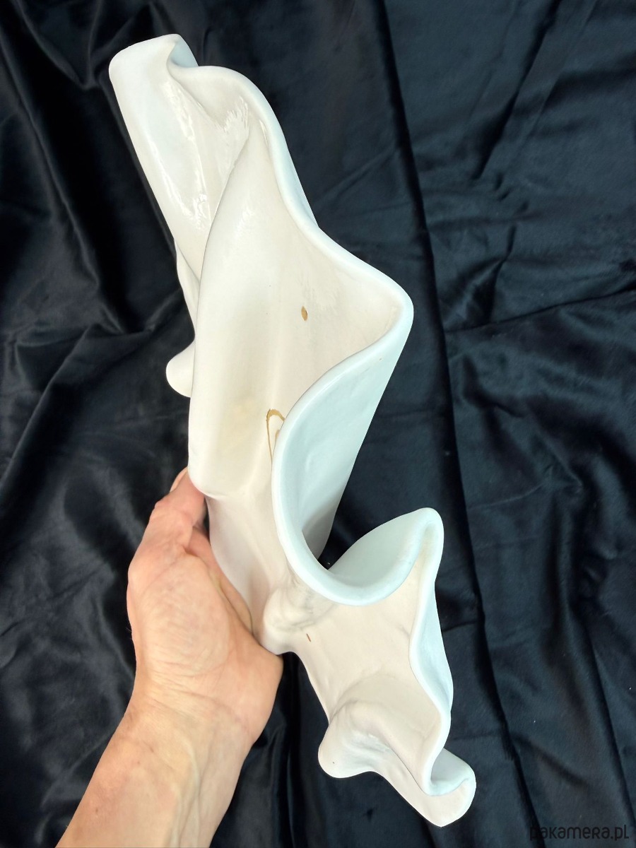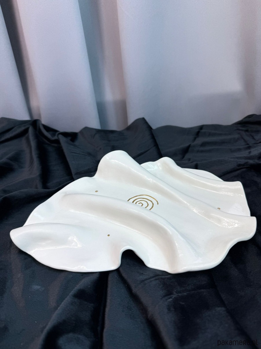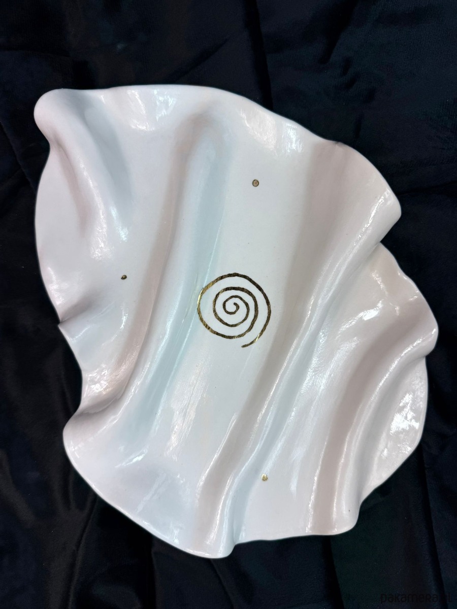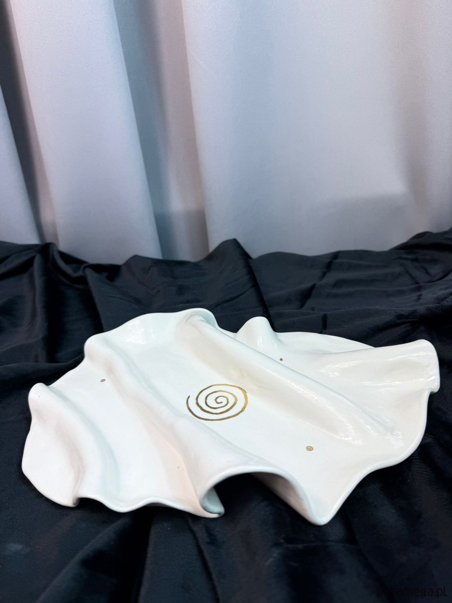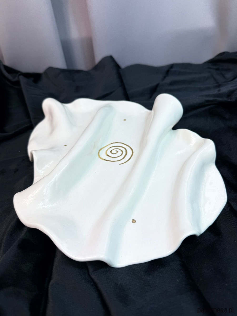 a wyjątkowa patera została wykonana ręcznie z wysokiej jakości białej porcelany, której organiczna, falująca forma nadaje całości rzeźbiarski charakter. Powierzchnię pokrywa transparentne szkliwo, a centralnym punktem kompozycji jest ręcznie malowany symbol spirali wykonany z prawdziwego złota. Drobne złote akcenty dopełniają całość, podkreślając jej unikatowy, artystyczny charakter.