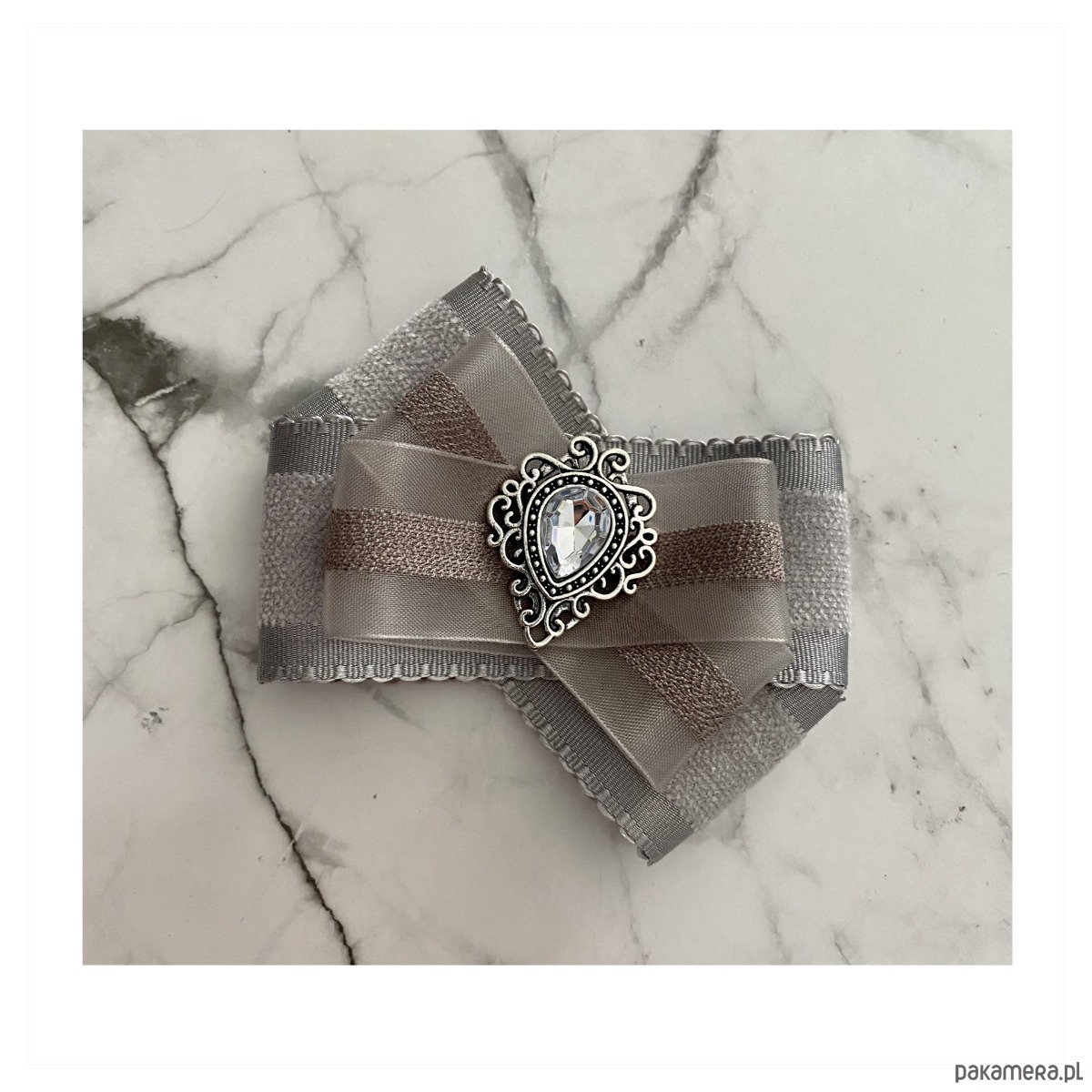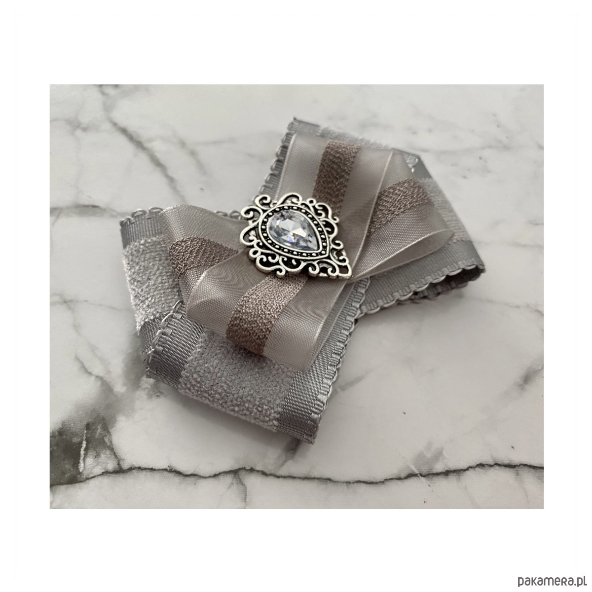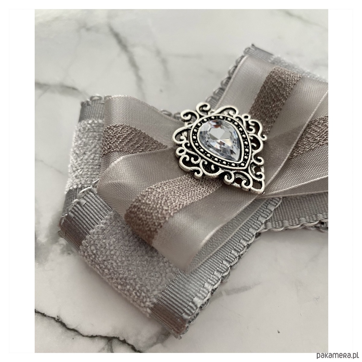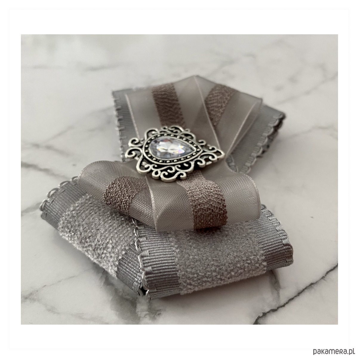 Broszka w kolorach delikatnej gołębiej szarości.