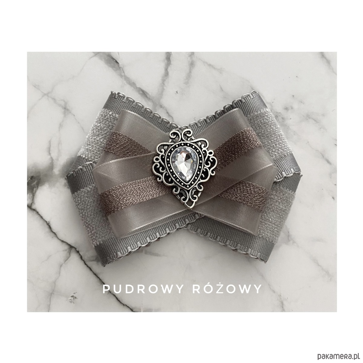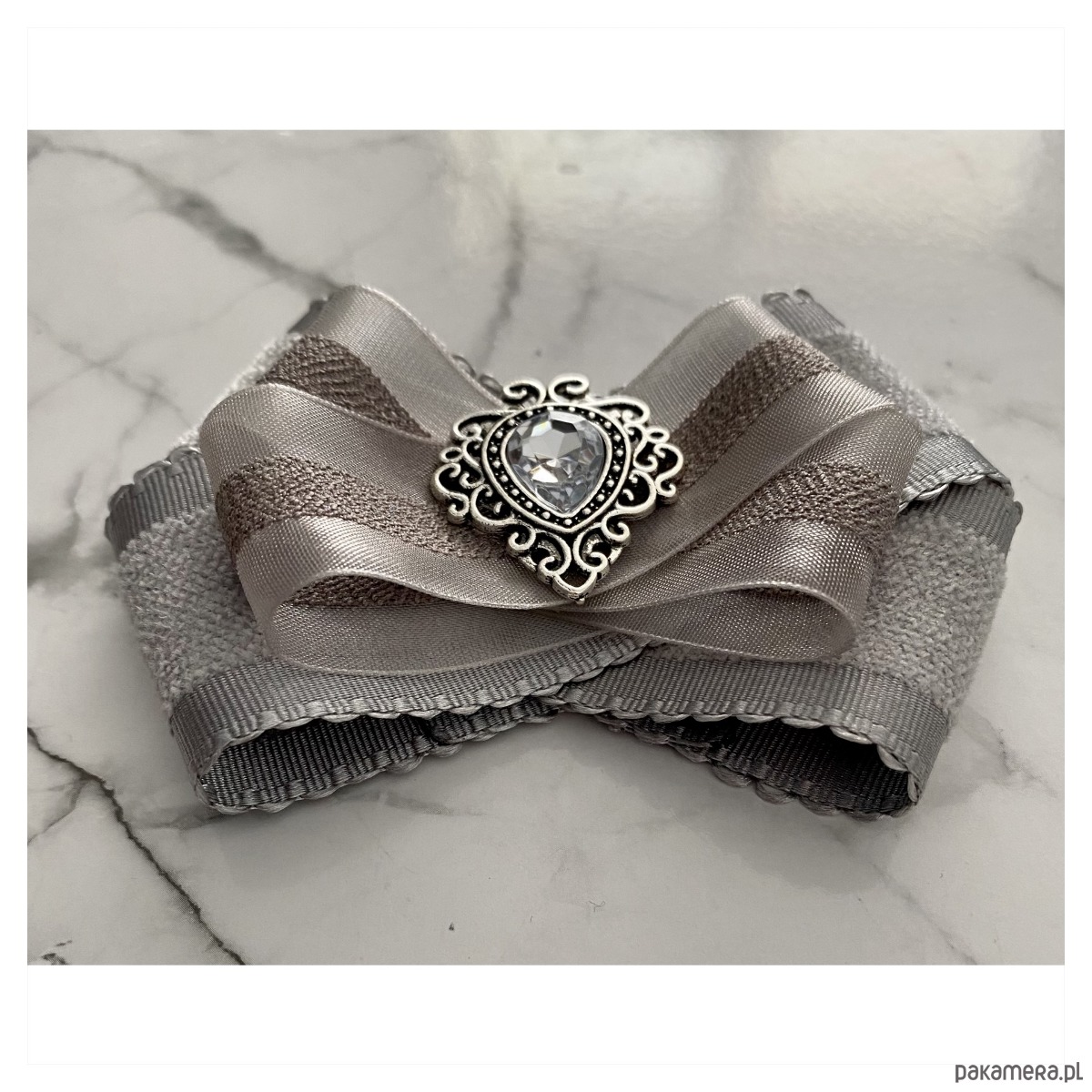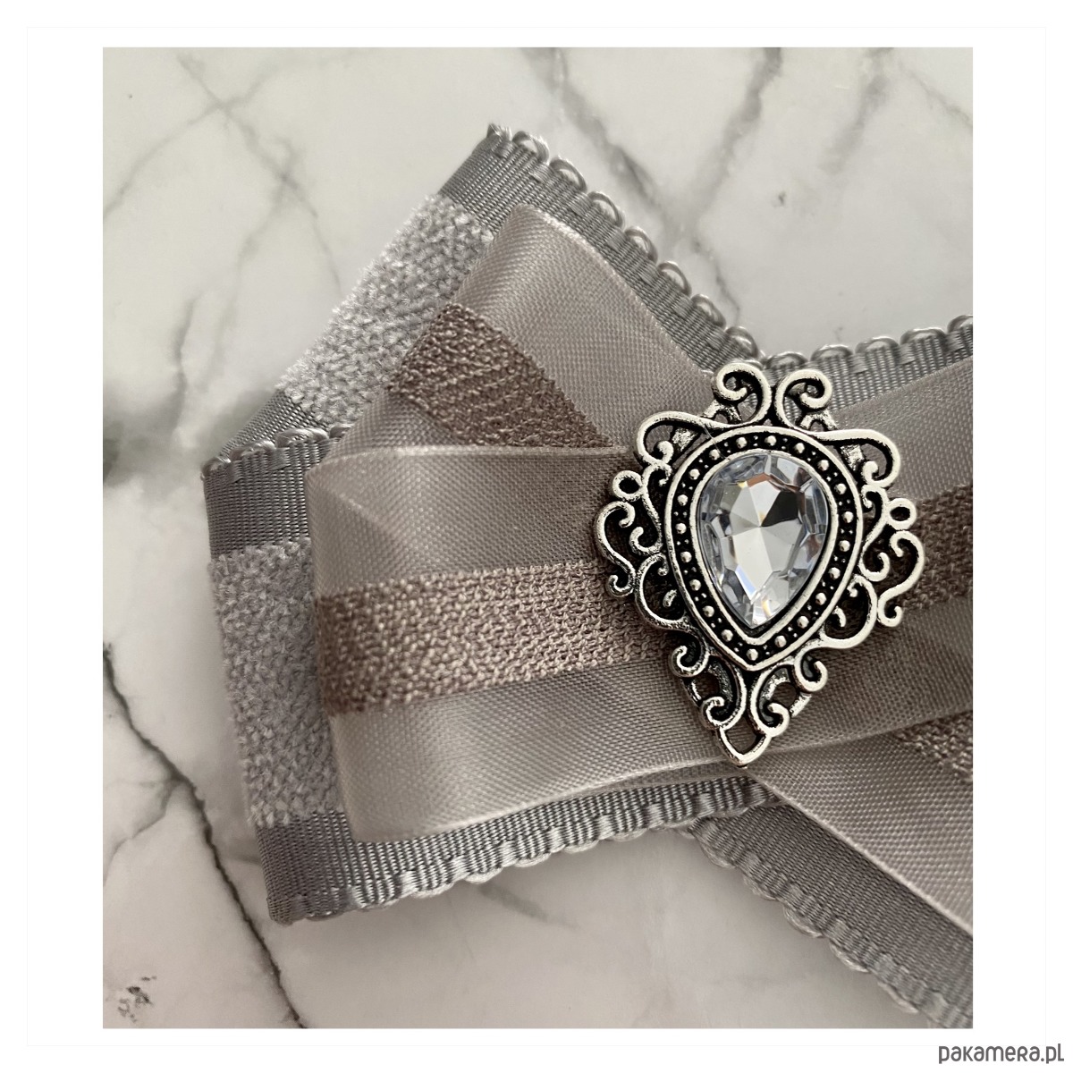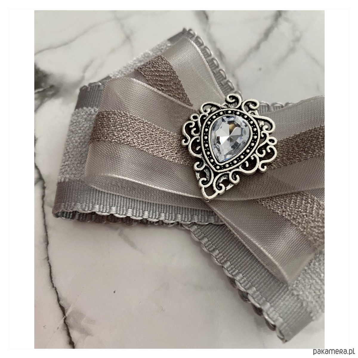 Broszka w kolorach delikatnej gołębiej szarości.