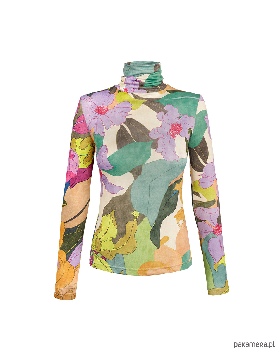 Longsleeve z golfem z linii BASIC. Uszyty z wysokogatunkowej dzianiny wiskozowej z printem roślinnym w kwiaty. Top dopasowuje się do Twojej sylwetki, podkreślając figurę, a jednocześnie zapewniając swobodę ruchów. Golfy różnią się ułożeniem wzoru.