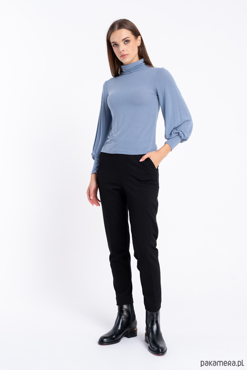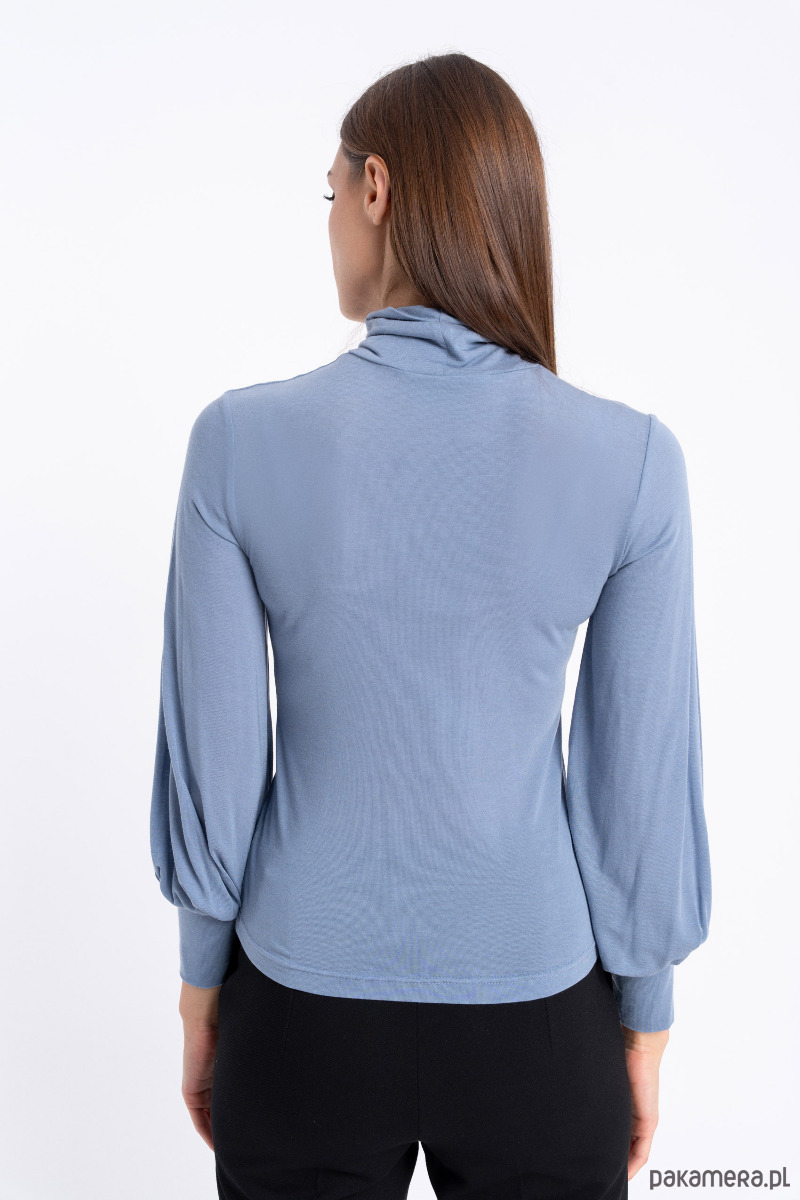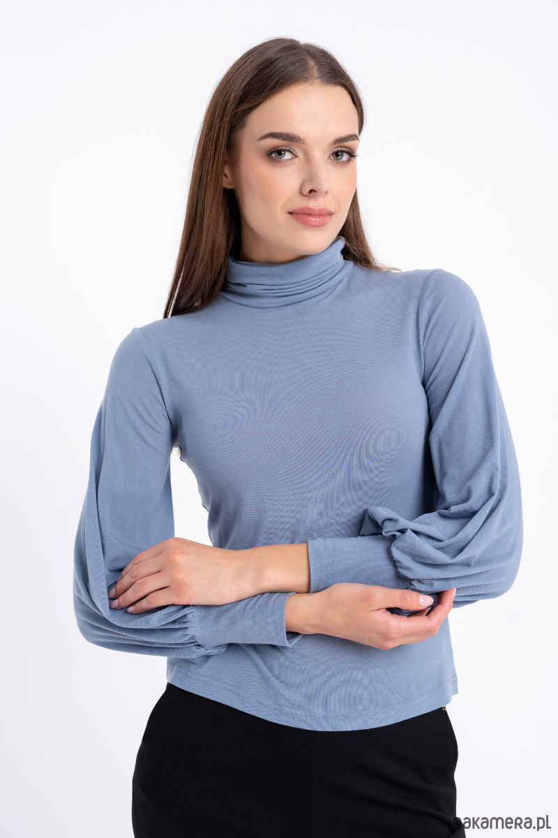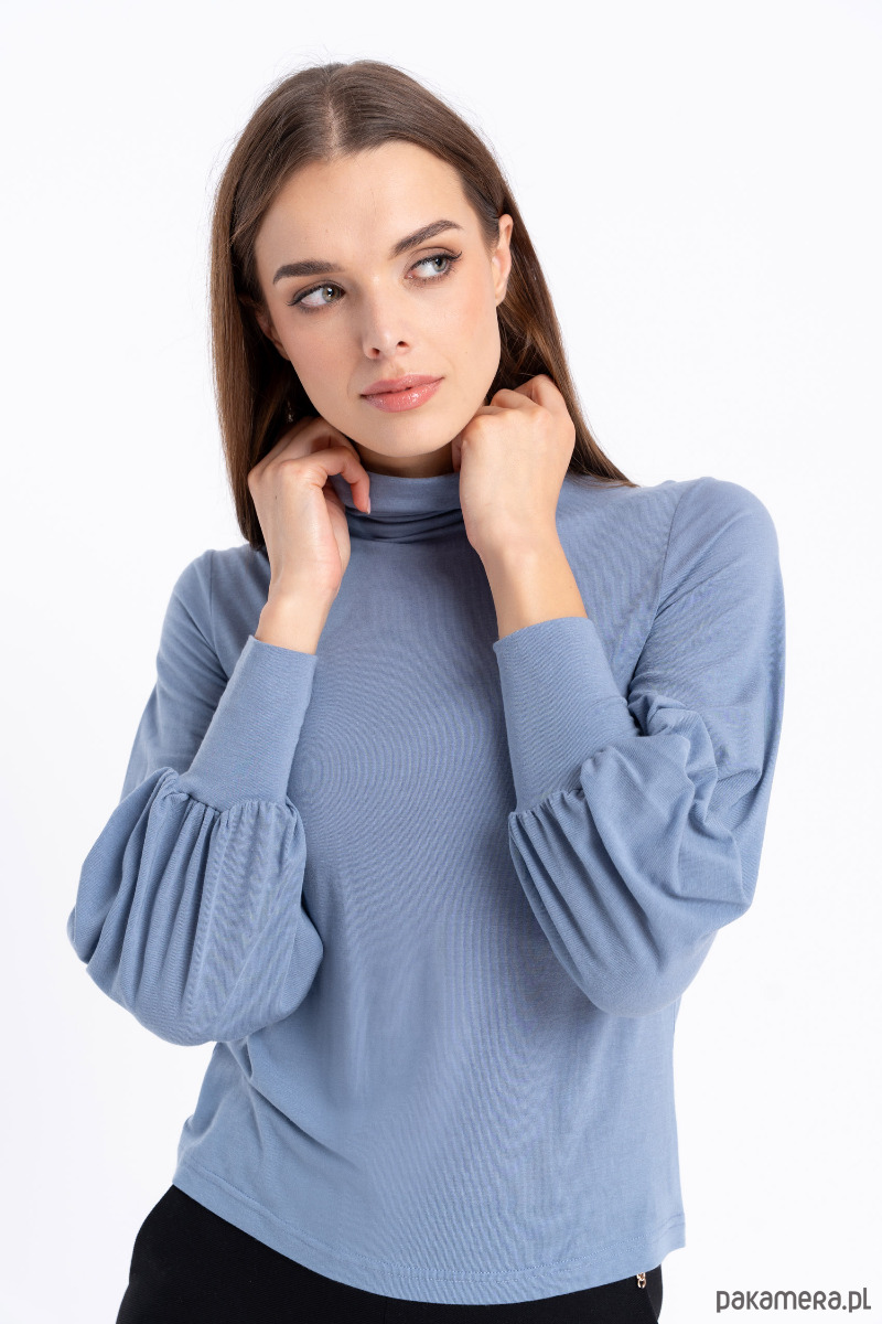 Golf z klasycznym wykończeniem przy szyi i rozszerzanymi, bufiastymi rękawami.