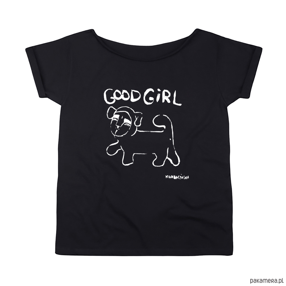 Niewinna? Nie do końca. „Good Girl” to koszulka, która bawi się konwencją – czarna baza, biały konturowy nadruk i przekorny tytuł, który mówi więcej, niż się wydaje.