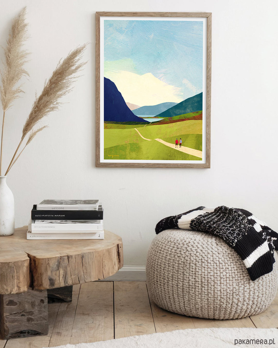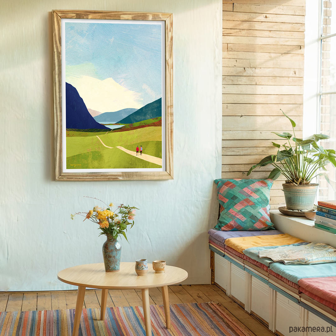 Plakat „Górskie wędrówki - dwa stawy w górach” to zielone przedstawienie wiosennego trekkingu. Dwójka wędrowców na szlaku zmierza w stronę błękitnych górskich stawów malowniczo położonych wśród gór. Plakat górski to świetna dekoracja domu, która nieodmiennie zapewnia zastrzyk pozytywnej energii.