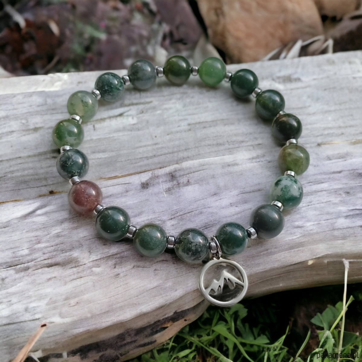 TUTAJ: urocza, delikatna bransoletka na solidnej lince elastycznej, wykonana z kuleczek wielobarwnego agatu (8mm) w odcieniach zieleni, z dodatkiem barw jesieni, przekładek ze srebrnego hematytu i zawieszki wykonanej ze stali szlachetnej (nie uczula, kolor nie ściera się)