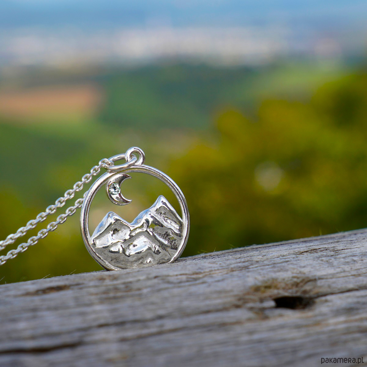 Góry i księżyc - srebrny naszyjnik, biżuteria z górami- biały kryształek