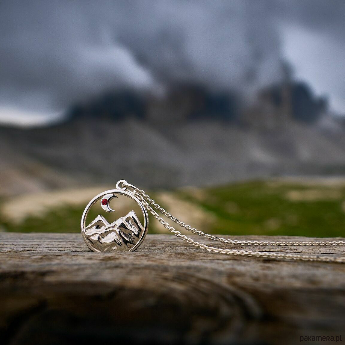Góry i księżyc - srebrny naszyjnik z czerwonym kryształkiem