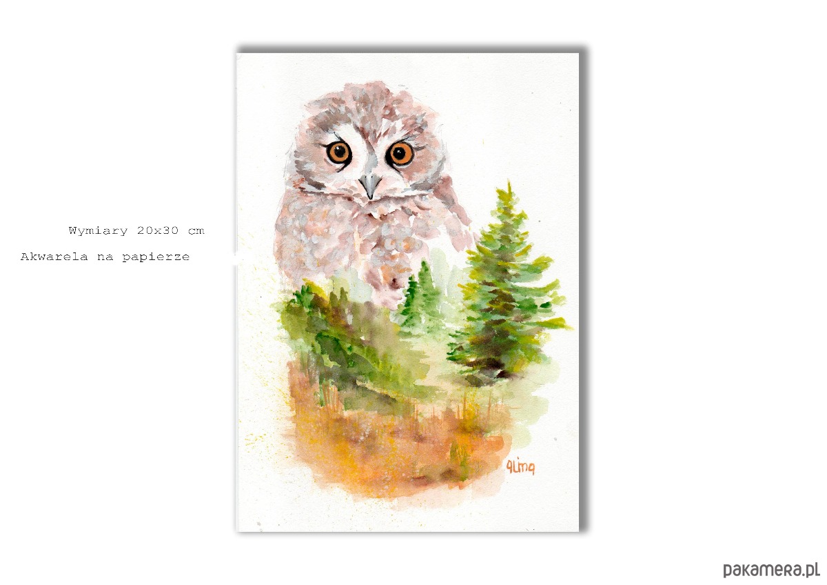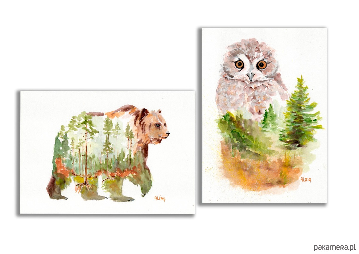 Góry. Las. Akwarela ręcznie malowana Sowa Niedźwiedź. Zestaw 2 szt