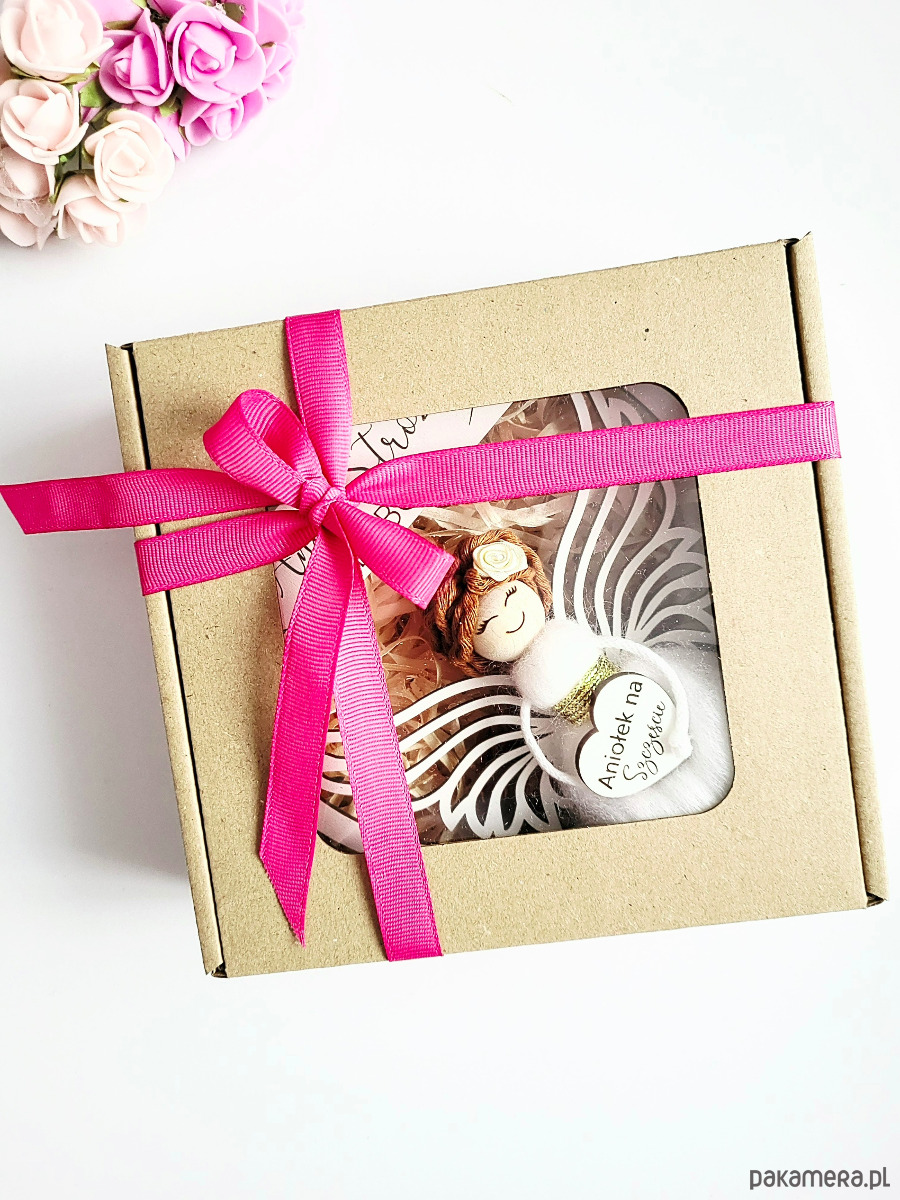 Gotowy do wręczenia mały prezent z zawiązaną różową kokardką!