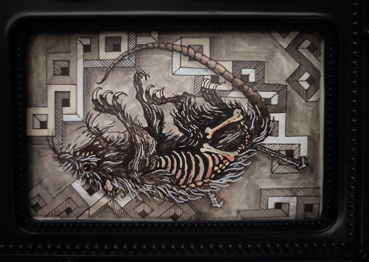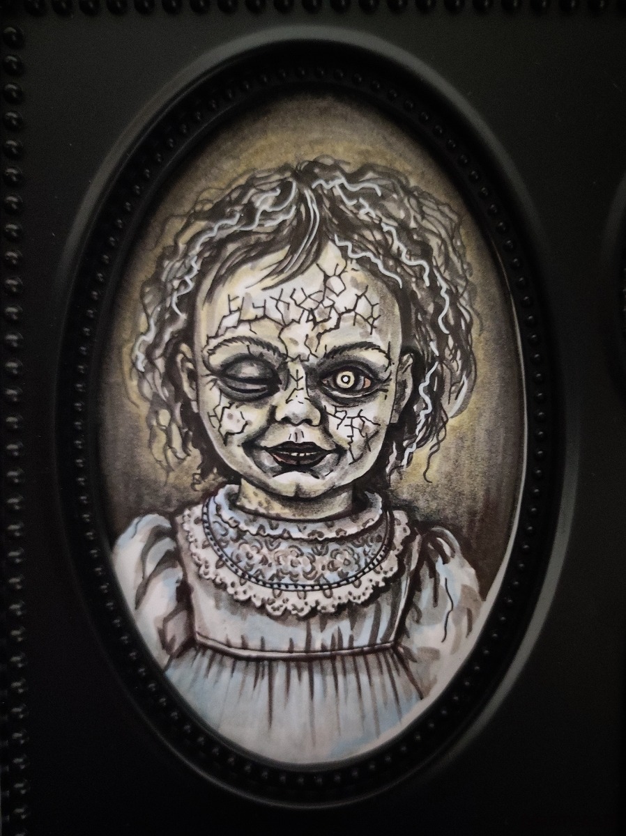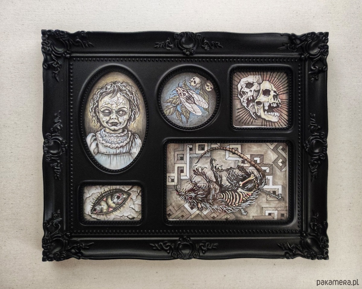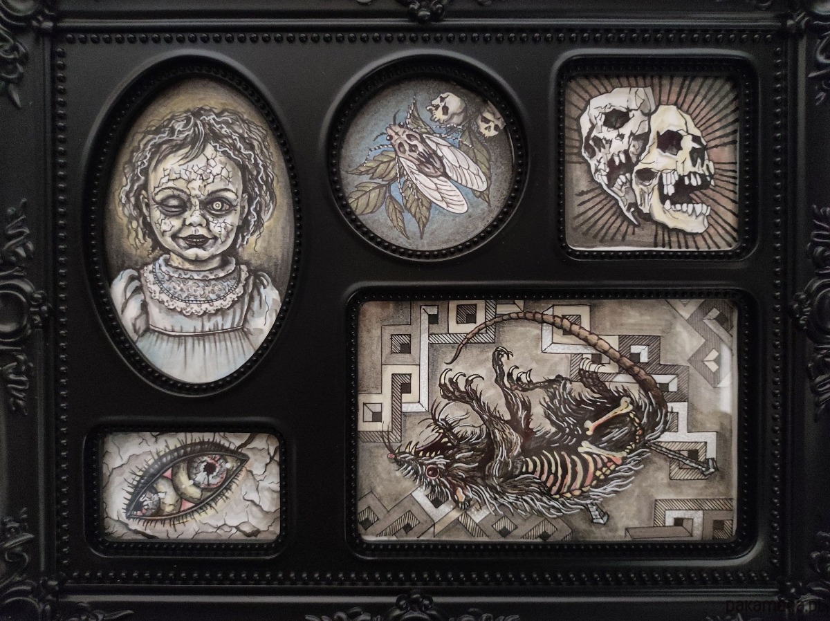 Zestaw ręcznie rysowanych obrazków w stylu vintage, tworzących gotycką minigalerię. Unikalna dekoracja stworzona tylko w jednym egzemplarzu.