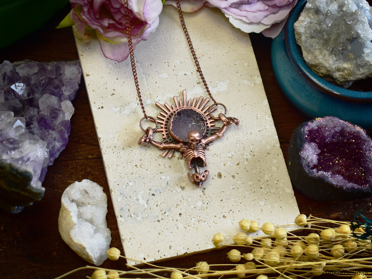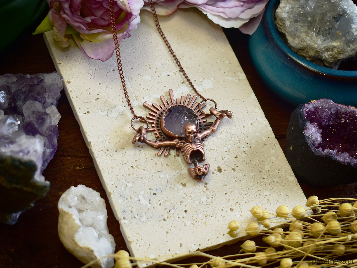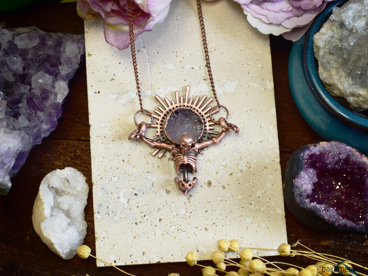 Elektroformowany wisiorek z miedzi o wyrazistym, artystycznym charakterze, przedstawiający ukrzyżowany szkielet. Nad czaszką osadzony został surowy, okrągły ametyst w ozdobnej koronie, którego naturalna struktura i kolor tworzą efekt promieni wychodzących zza głowy, nadając całości symboliczny i niemal mistyczny wyraz. Surowość miedzi w połączeniu z precyzyjnym wykonaniem detali podkreśla dramatyzm i ekspresję wisiorka. To odważny, gotycki projekt dla osób ceniących artystyczną, unikatową biżuterię oraz interesujące zestawienia kamieni szlachetnych i motywów symbolicznych.