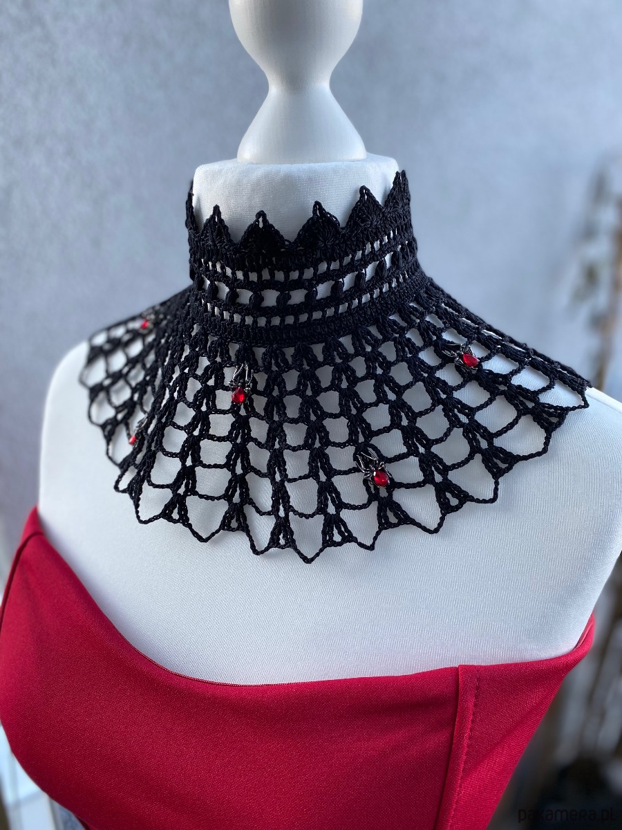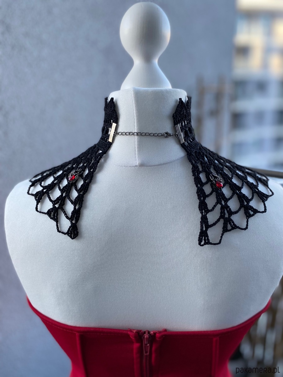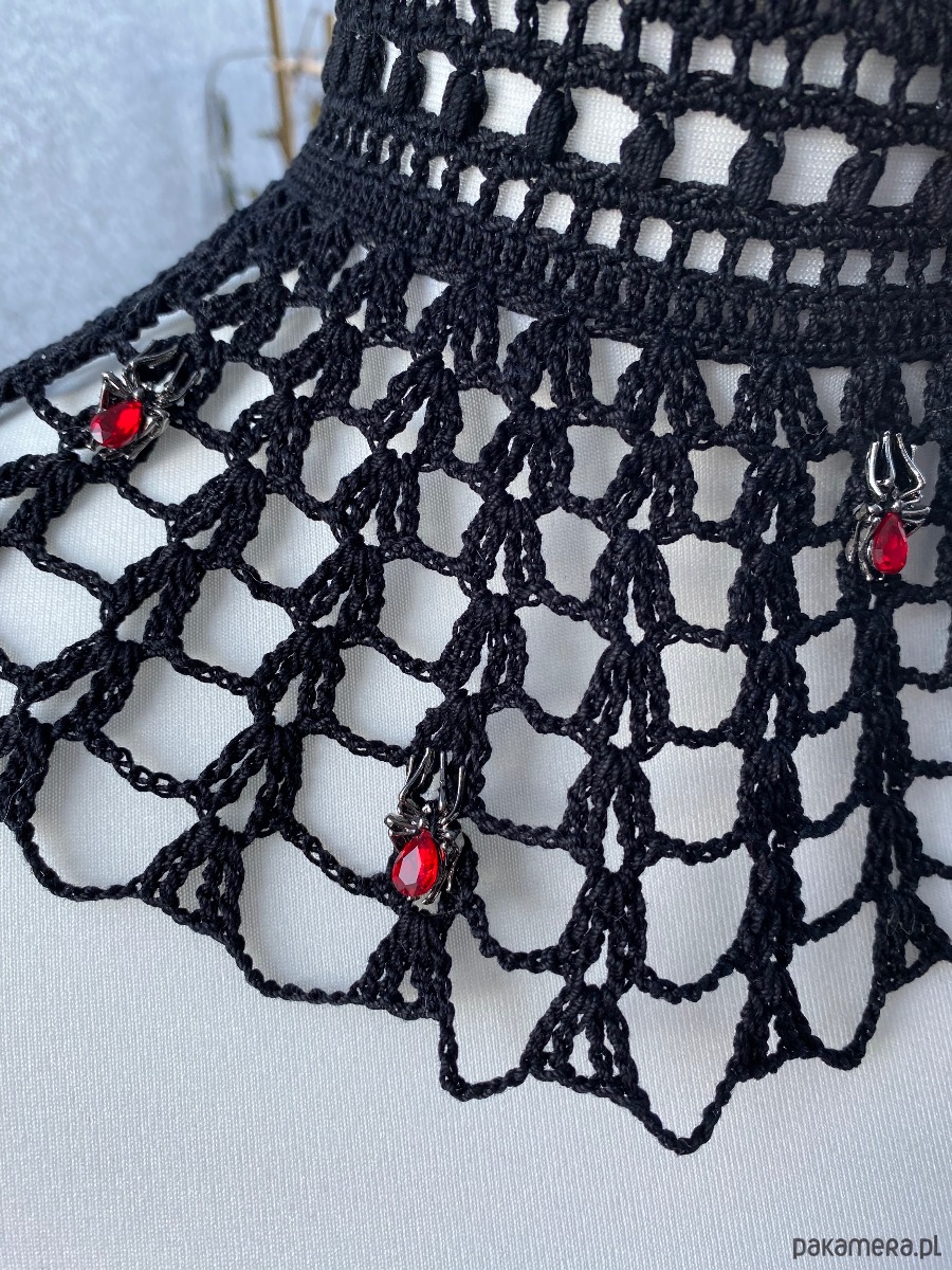 Gotycki naszyjnik koronkowy, pajęczyna 🕸️ z pajączkami 🕷️sympatyczne i nie groźne, połyskujące czerwonymi kamieniami❤️