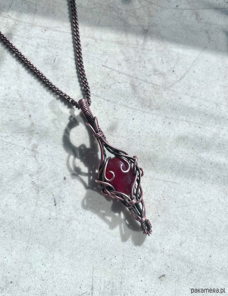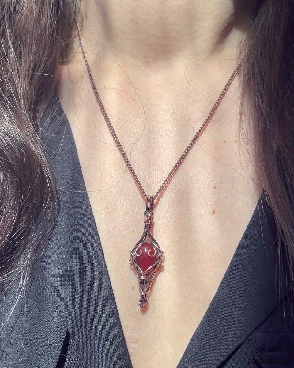 Unikalny naszyjnik z karneolem dla wielbicieli gotyckich i alternatywnych klimatów ale w subtelnym wydaniu. Świetnie nadaje się za równo na co dzień jak i na specjalne okazje np. na ślub czy wesele. Ozdoba po oksydacji (postarzana) oraz szlifowaniu. Nie drapie i jest komfortowa w noszeniu. Karneol znany jest ze swoich właściwości, które dodają pewności siebie i energii. Sprzedaję na stalowym łańcuszku koloru miedzi długości 50 cm z możliwością modyfikacji. Po zakupie napisz jakiej długości ma być łańcuszek. Wisiorki są ręcznie robione i nieznacznie różnią się od siebie. Każdy z nich jest unikatowy- wzory są niepowtarzalne. Zdjęcia przedstawiają przykładowe wisiorki.