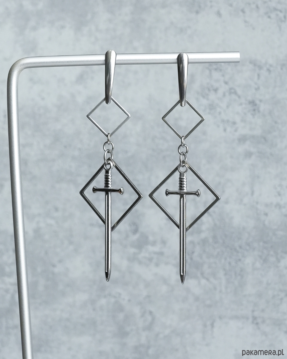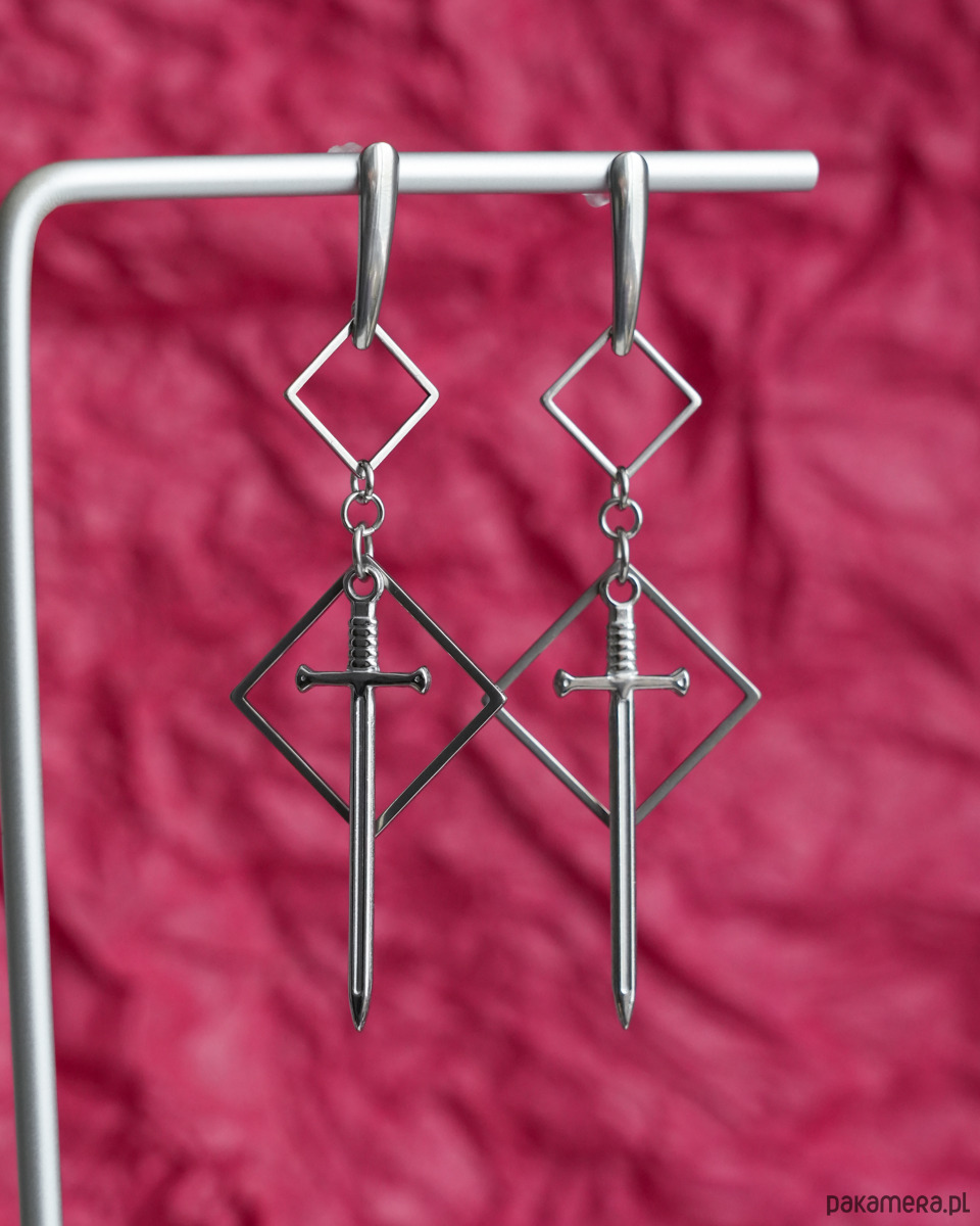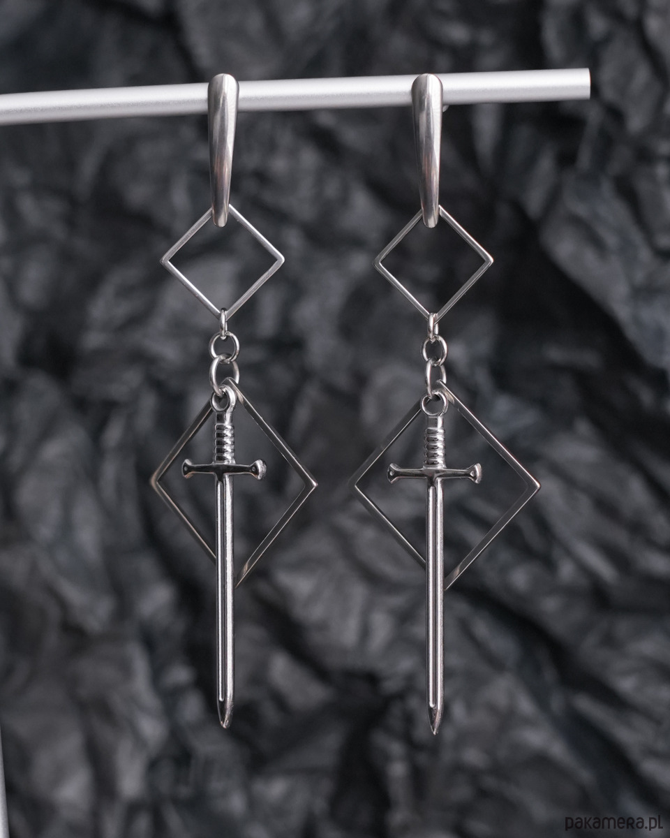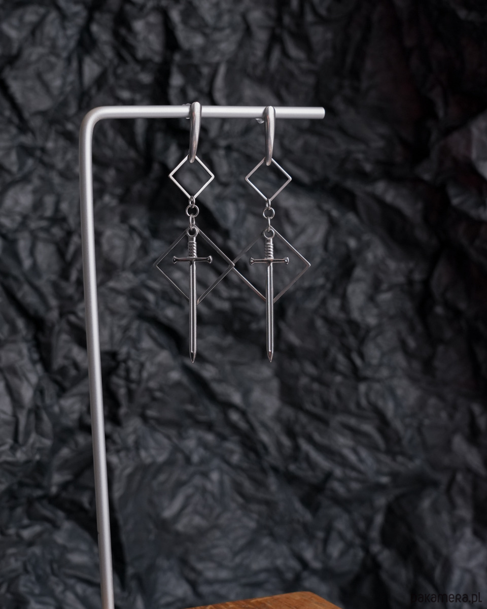 Bardzo efektowne, nowoczesne, wiszące kolczyki z mieczami, zawieszone na ozdobnych, podłużnych sztyftach. Mega oryginalne, na pewno będą przykuwać wzrok. Świetne dla fanek i fanów alternatywy - stylu modern goth, rock, punk, fantasy, itd.