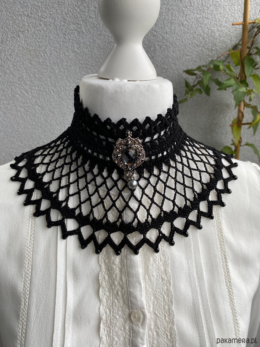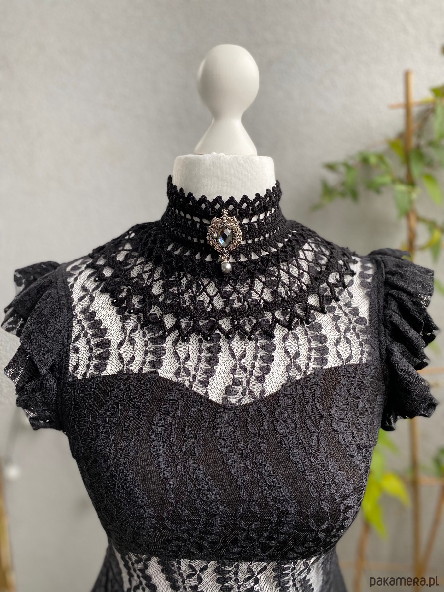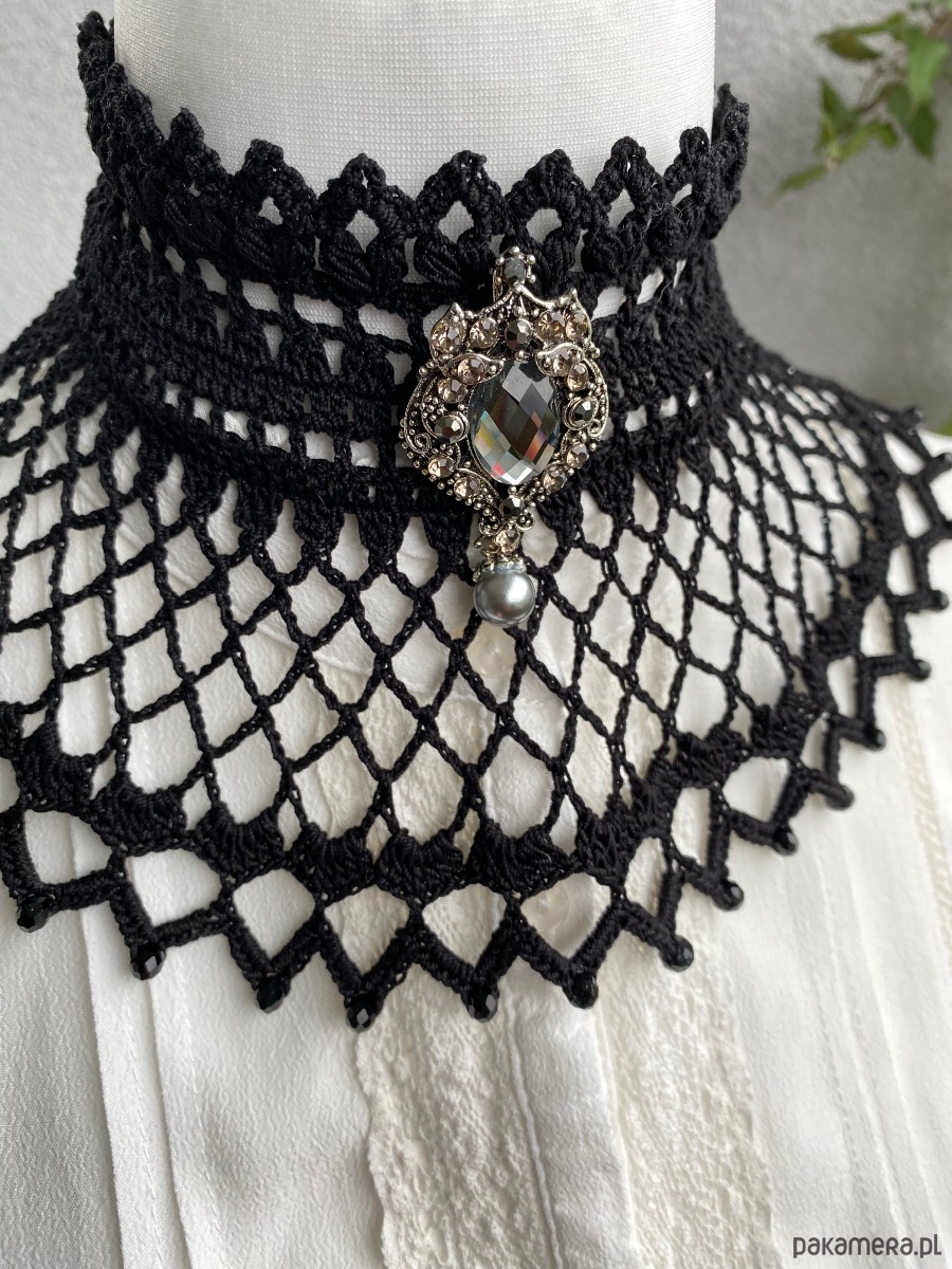 🕸️ Elegancki, naszyjnik typu choker, stworzony z czarnej koronki o misternym, siateczkowym splocie. W centrum ozdobiony jest dekoracyjną broszą ( można ją odpiąć) z czarnym kryształem i perłowym akcentem, co nadaje mu wyjątkowego, wiktoriańskiego charakteru.Na końcach koronki błyszczące czarne fasetowane koraliki.