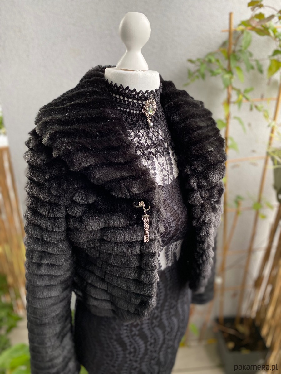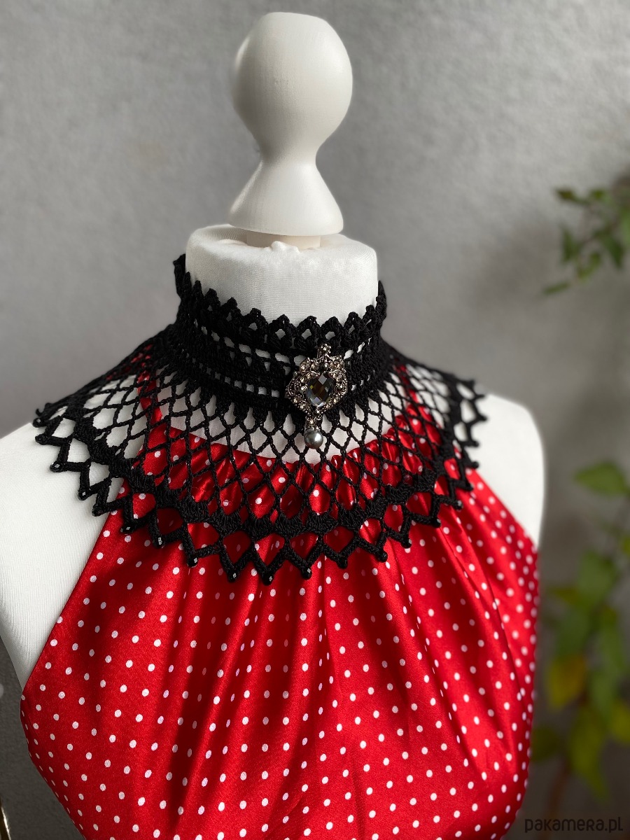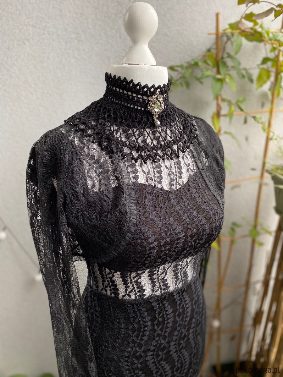 🕸️ Elegancki, naszyjnik typu choker, stworzony z czarnej koronki o misternym, siateczkowym splocie. W centrum ozdobiony jest dekoracyjną broszą ( można ją odpiąć) z czarnym kryształem i perłowym akcentem, co nadaje mu wyjątkowego, wiktoriańskiego charakteru.Na końcach koronki błyszczące czarne fasetowane koraliki.