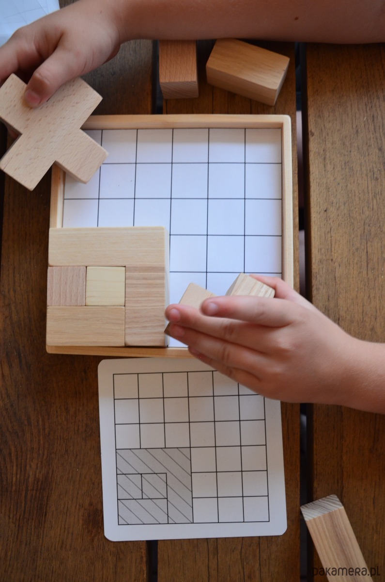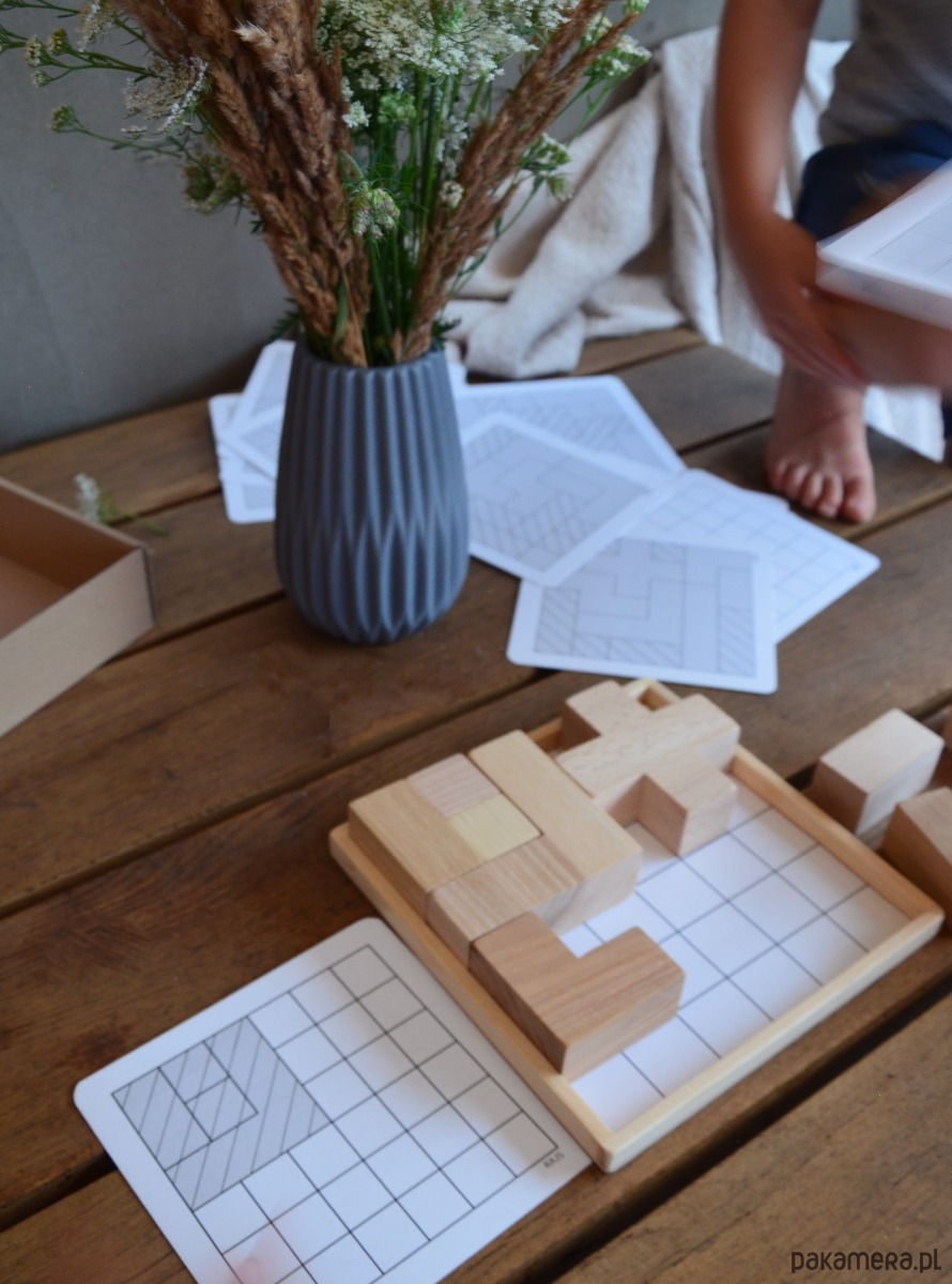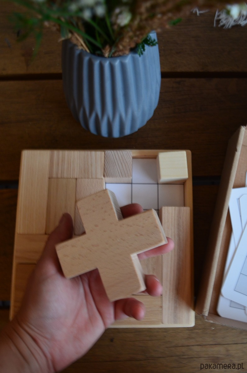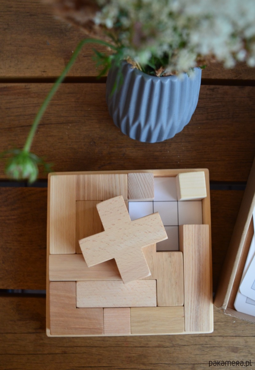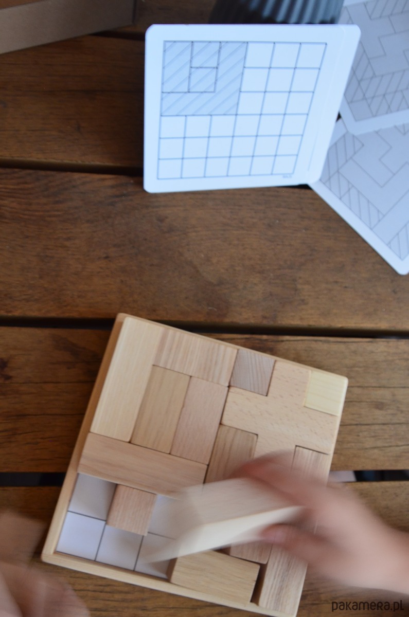 Klocki drewniane – tzw tetris, wykonany z kilku gatunków drewna, co nadaje ciekawe połączenie, wszystko to na drewnianej podstawie wraz z zestawem 10 kart do układania wzorów