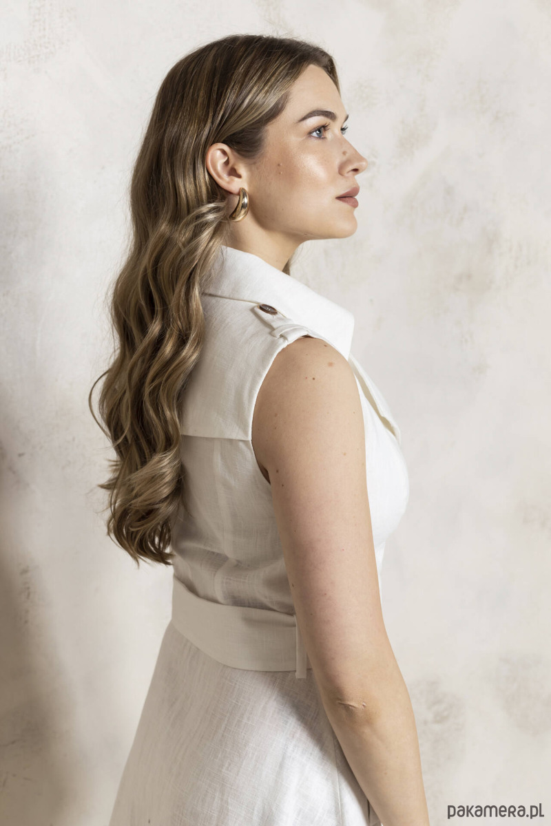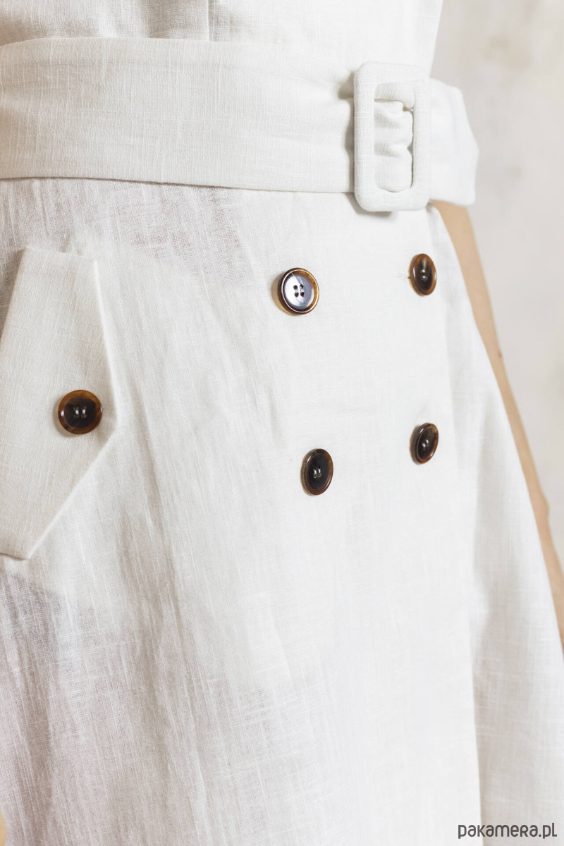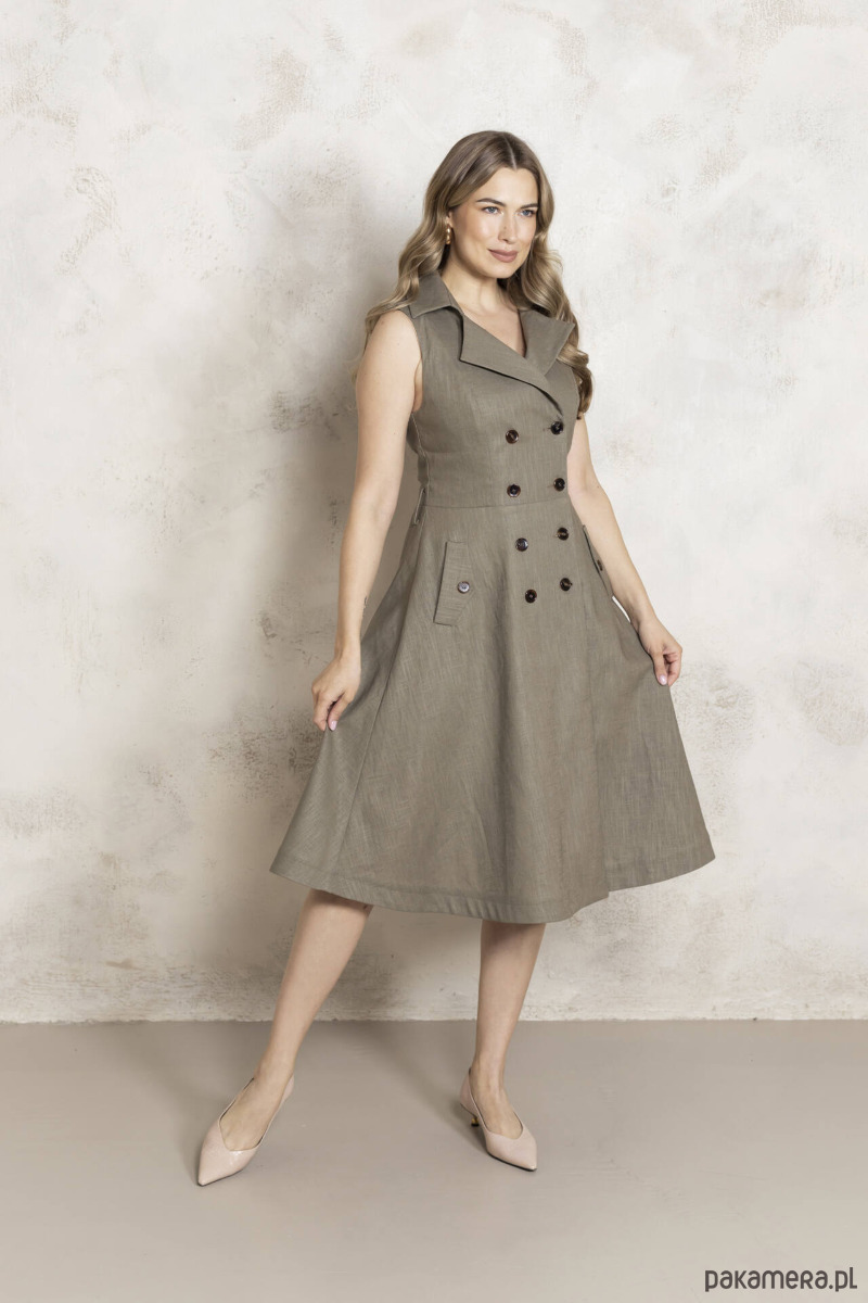 Sukienka lniana o ponadczasowym kroju inspirowanym trenczem. Taki klasyczny krój eleganckiej sukienki idealnie komponującej się z kobiecą sylwetką. Dekolt w V wysmukla, pasek podkreśla talię, dół wysmukla oddalając się trapezowo łagodnie od bioder. Lekko usztywniony brzeg dołu nadaje jej pięknej linii i oddala od nóg w upalne dni!
