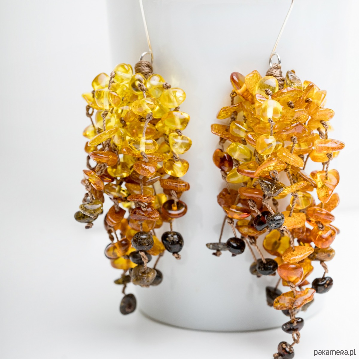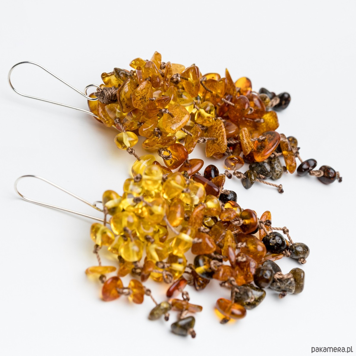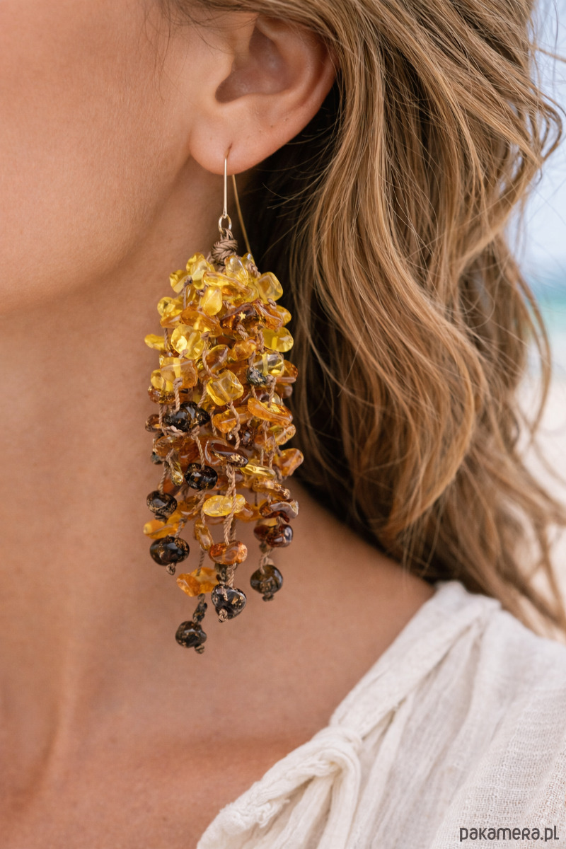Kolczyki te zostały wykonane z bursztynowych, nieregularnych kamieni w różnych odcieniach, od jasnej cytryny do ciemnego koniaku. Kaźdy koralik został zabezpieczony supełkiem. Zapięcie zostało wykonane ze srebra próby 925. Kolczyki te doskonale wpisują się w estetykę boho.