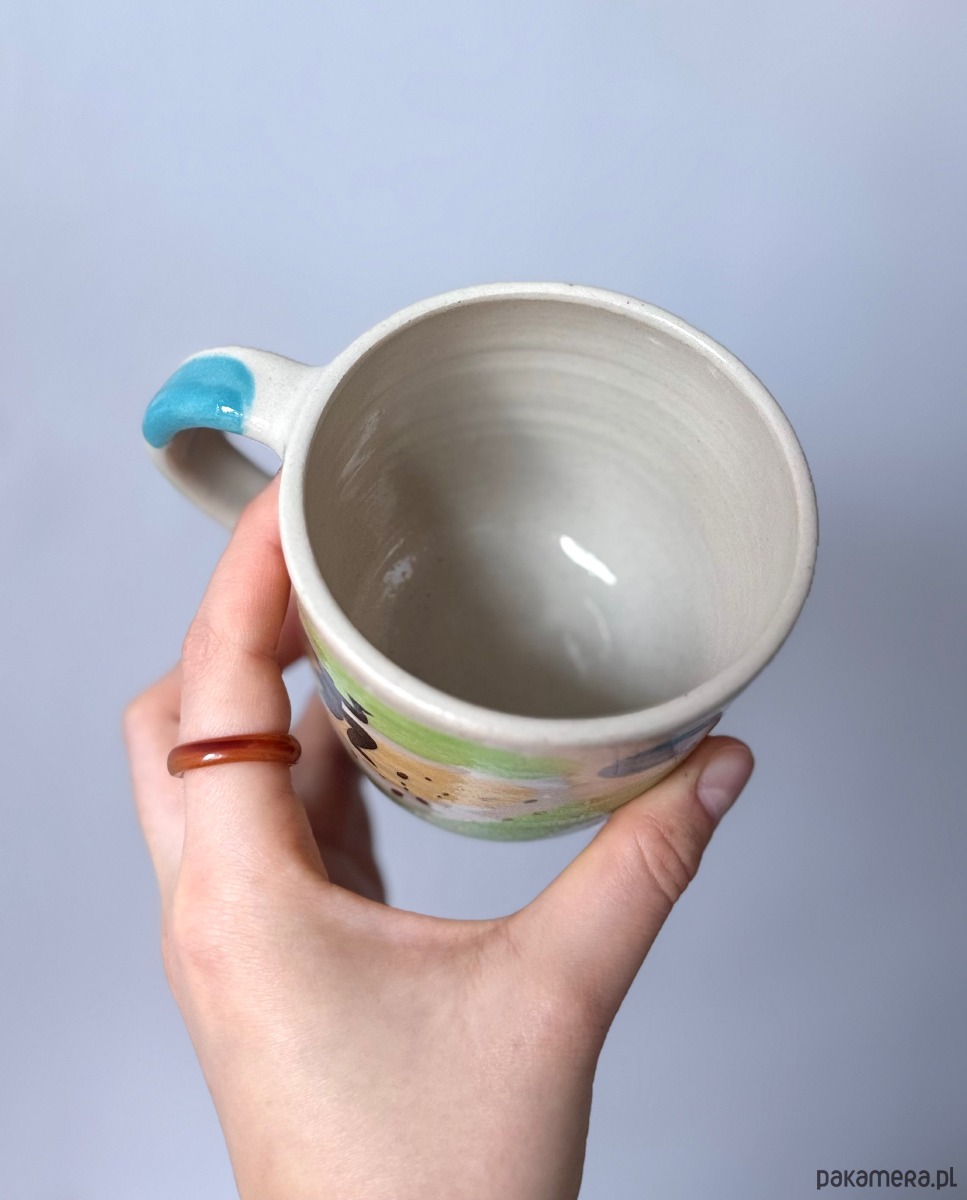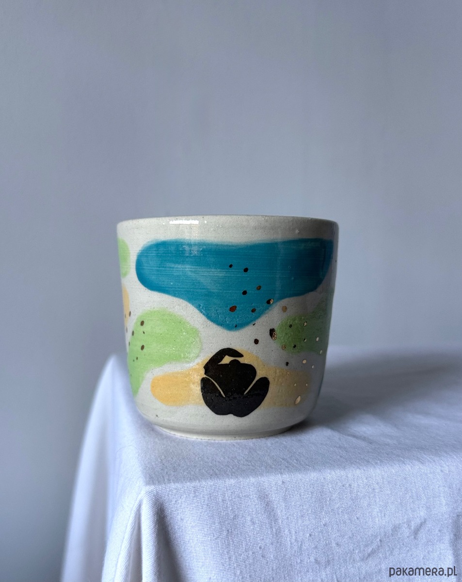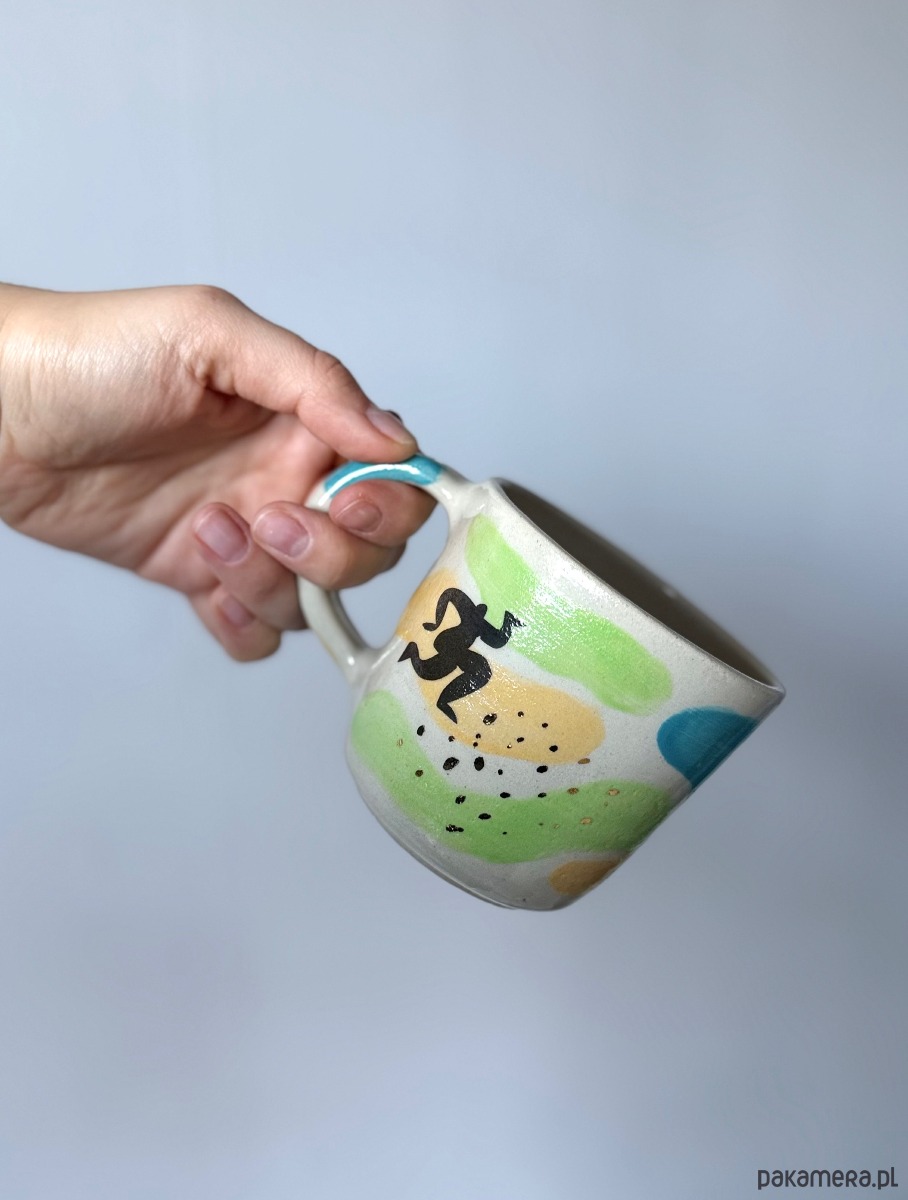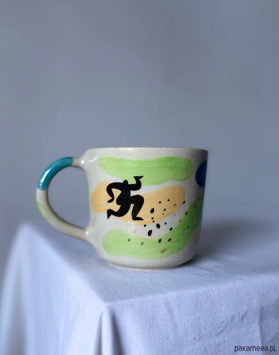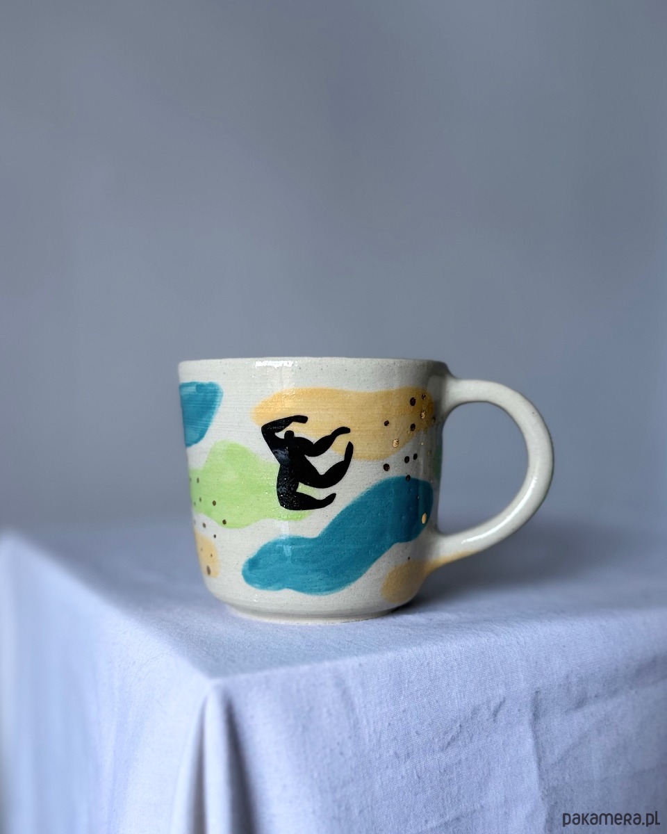 Kamionkowy, graficzny kubek zdobiony farbami podszkliwnymi, kalką i złotem naszkliwnym. Kubek został wytoczony na kole garncarskim z jasnej, szamotowej gliny. Kolorowe, pastelowe plamy w odcieniach błękitu, zieleni i żółtego, złote cętki oraz autorskie grafiki przedstawiające ludzkie sylwetki w różnych pozach, nadają kubkom wesoły charakter. Wygodne, spłaszczone ucho sprawia, że kubek idealnie leży w dłoni.
