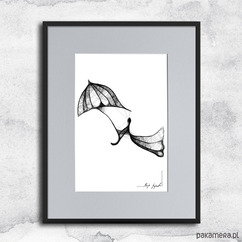 Grafika wykonana techniką mieszaną (giclée+rysunek isografem) na białym, matowym o lekko fakturowanej powierzchni, graficznym papierze Canson 160-250g. Unikalna kreska wygląda bardzo efektownie, zaś czarno-białe wykończenia wnętrz idealnie wpisują się puste w ściany nowoczesnych, minimalistycznych czy loftowych powierzchni.