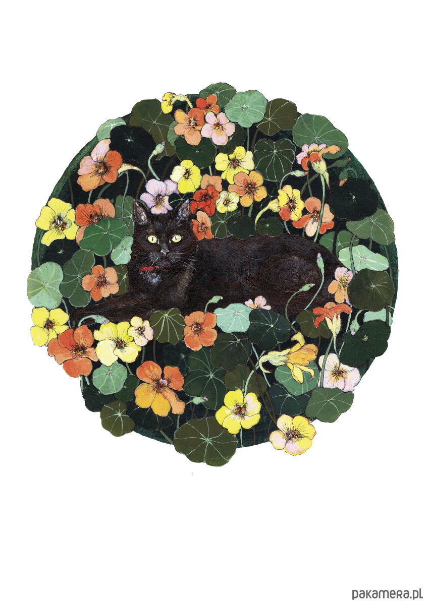 Czarny kot i nasturcje, to wydruk jednej z autorskich ilustracji