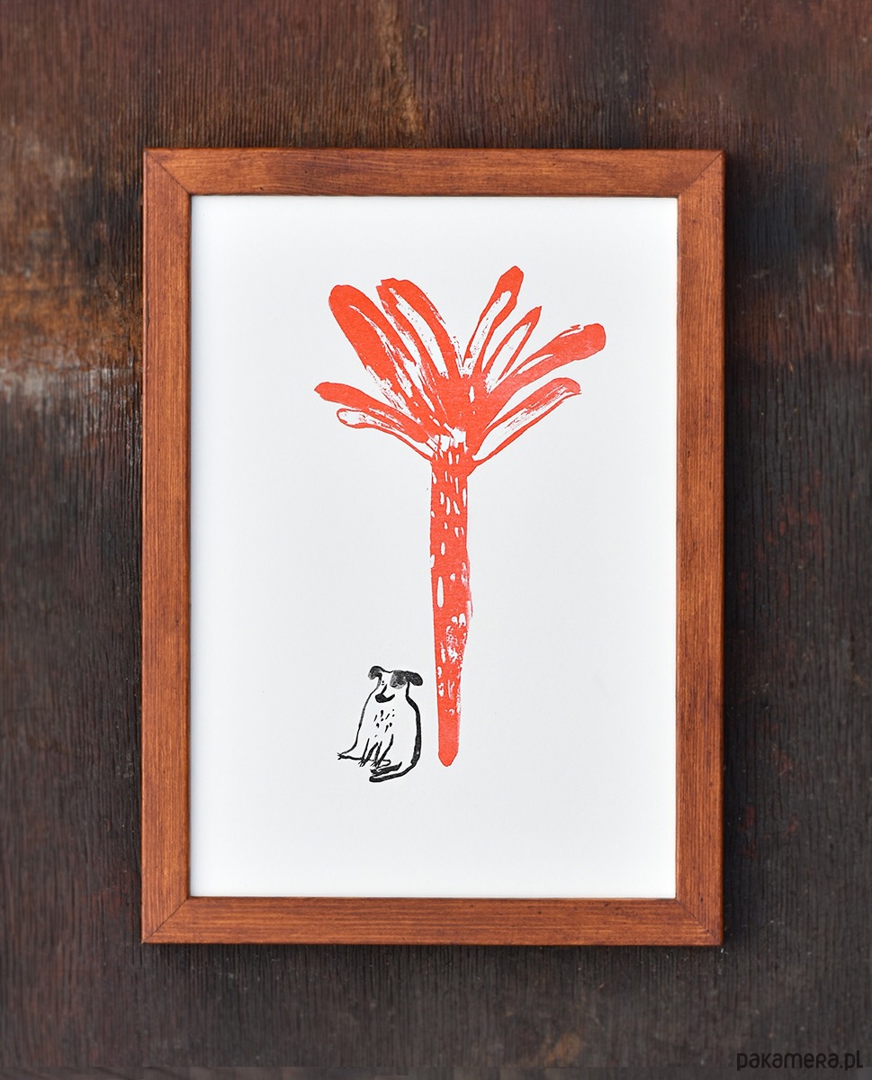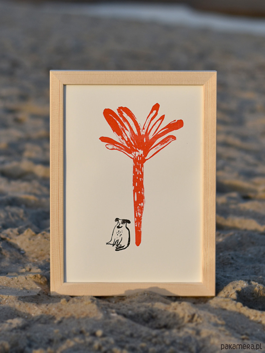 Grafika Piesek na wakacjach została wydrukowany metodą risografii, która pozwala uzyskać wyjątkowo intensywne, piękne kolory. Technika ta nadaje pracy unikalny efekt i sprawia, że każdy egzemplarz jest trochę inny i niepowtarzalny.