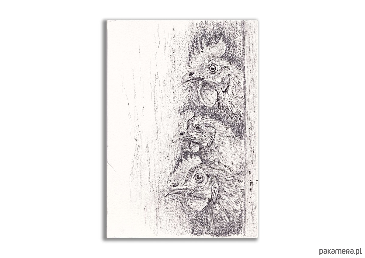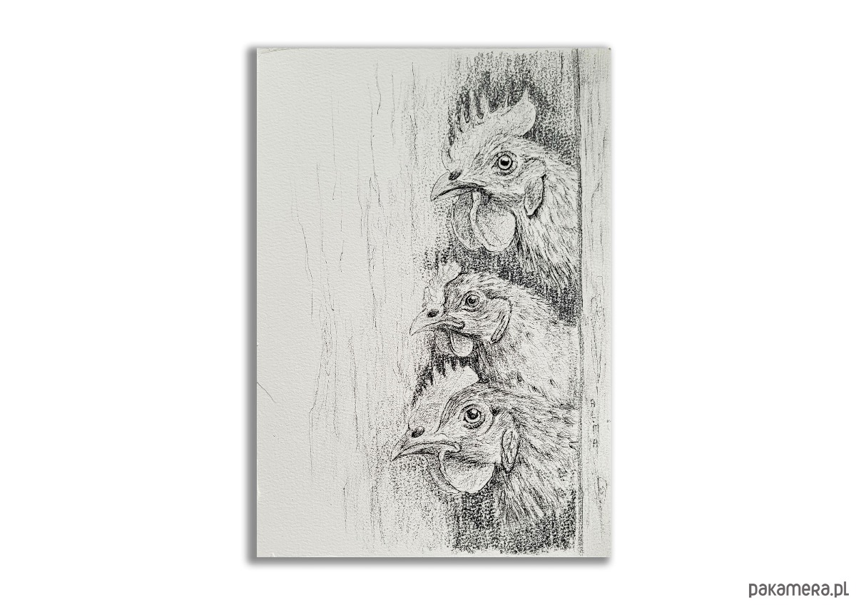 Oryginalny, ręcznie wykonany rysunek ołówkiem przedstawiający trzy ciekawskie kurczaki.
