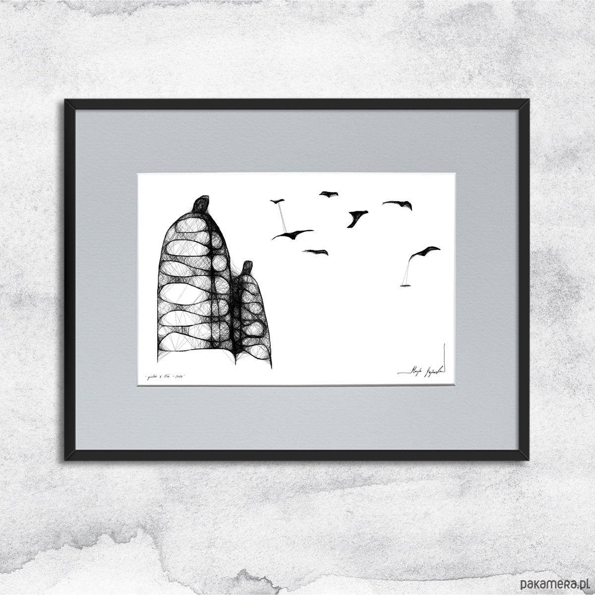 Autorska grafika wykonana techniką mieszaną (giclée, rysunek isografem) na białym, lekko fakturowanym graficznym papierze. Unikalna kreska wygląda bardzo efektownie, zaś czarno-białe wykończenia wnętrz idealnie wpisują się puste w ściany nowoczesnych, minimalistycznych czy loftowych powierzchni.