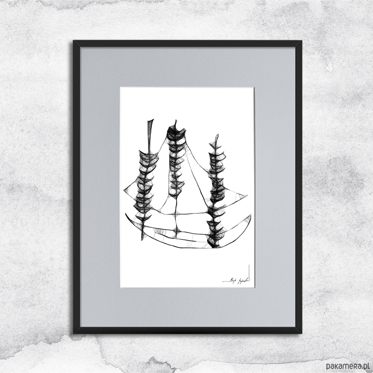 Grafika została wykonana techniką mieszaną (giclée + rysunek isografem) na białym, matowym, graficznym papierze Canson 250g o lekko fakturowanej powierzchni. Unikalna kreska wygląda bardzo efektownie, zaś czarno-białe wykończenia wnętrz idealnie wpisują się w puste ściany nowoczesnych, minimalistycznych, ale również klasycznych powierzchni. Grafika nr 19 to propozycja skierowana przede wszystkim do osób lubiących marynistyczne motywy w sztuce. Ta oryginalna, czarno-biała grafika, na której widoczny jest statek, sprawdzi się jako dopełnienie salonu lub gabinetu.